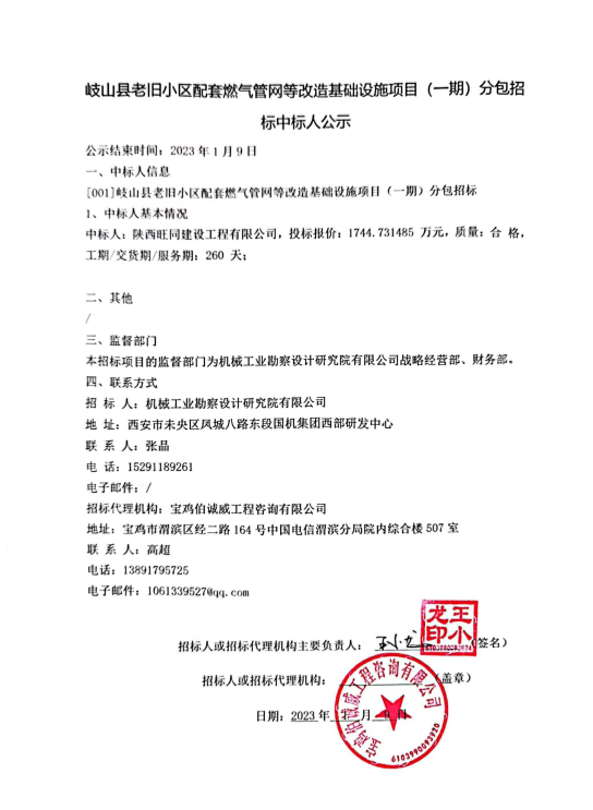 岐山县老旧小区配套燃气管网等改造基础设施项目(一期)分包招标中标人公示