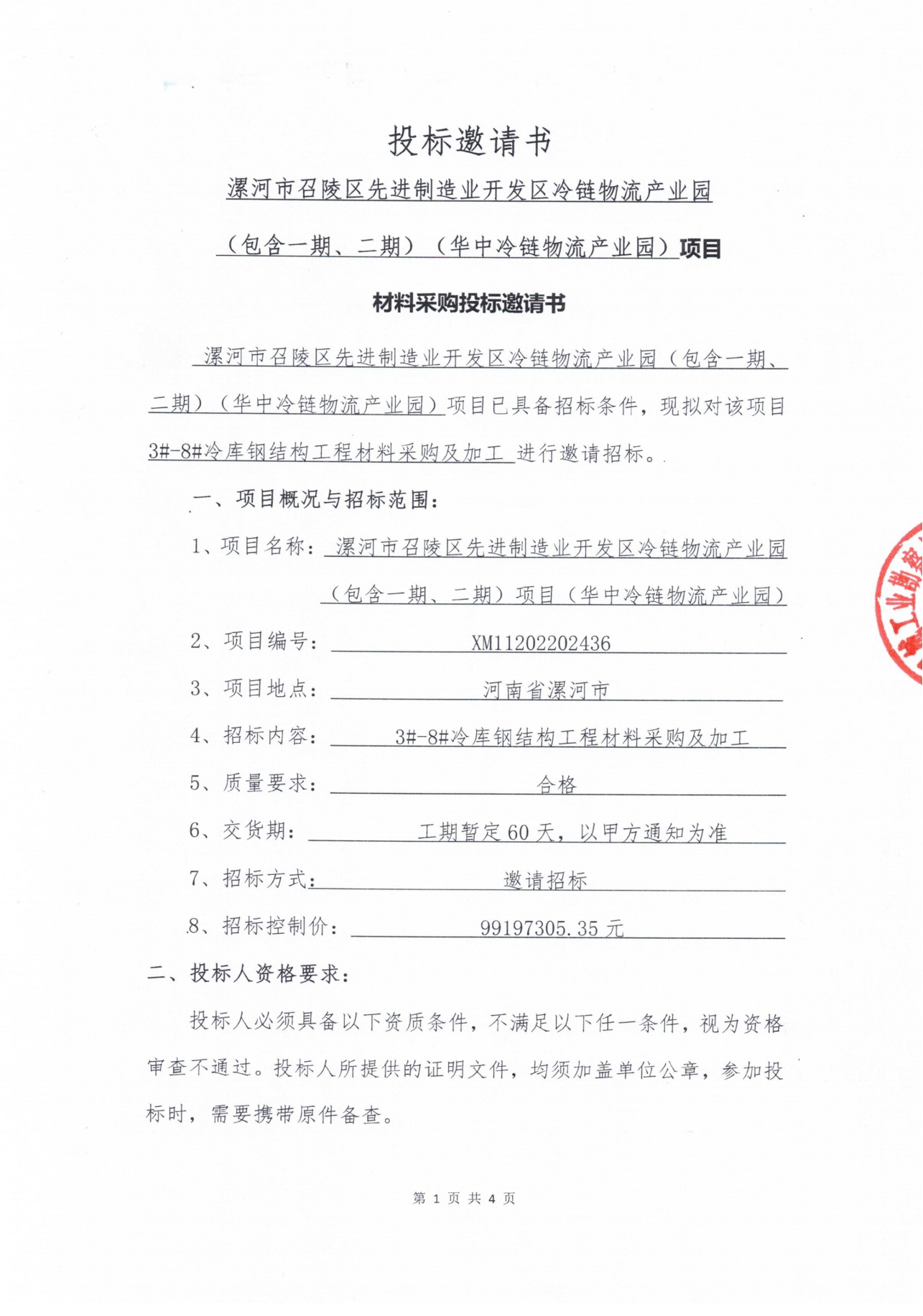 漯河市召陵区先进制造业开发区冷链物流产业园(包含一期、二期)项目(华中冷链物流产业园)钢结构工程材料采购及加工投标邀请书