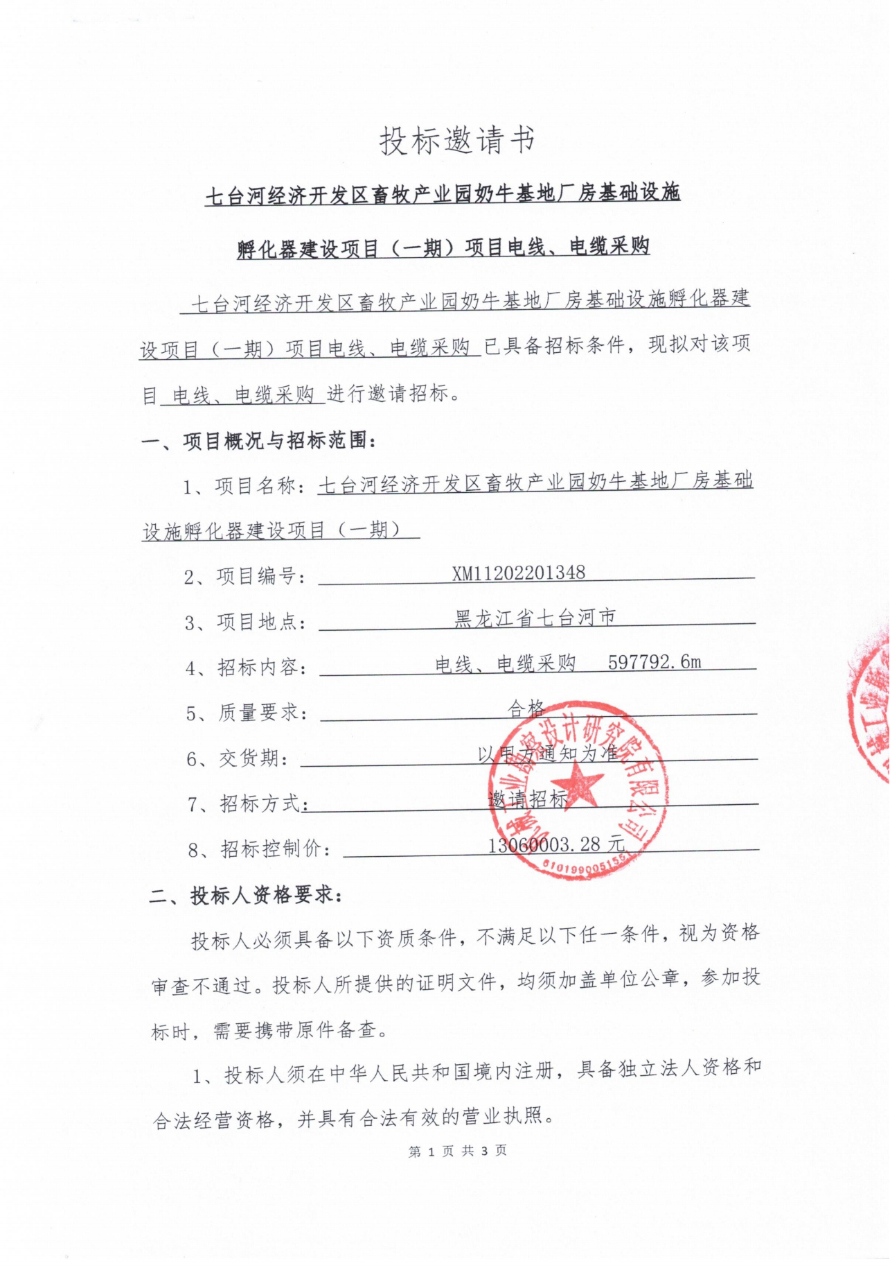 七台河经济开发区畜牧产业园奶牛基地 厂房基础设施孵化器建设项目 (一期) 电线、电缆缆采购投标邀请书