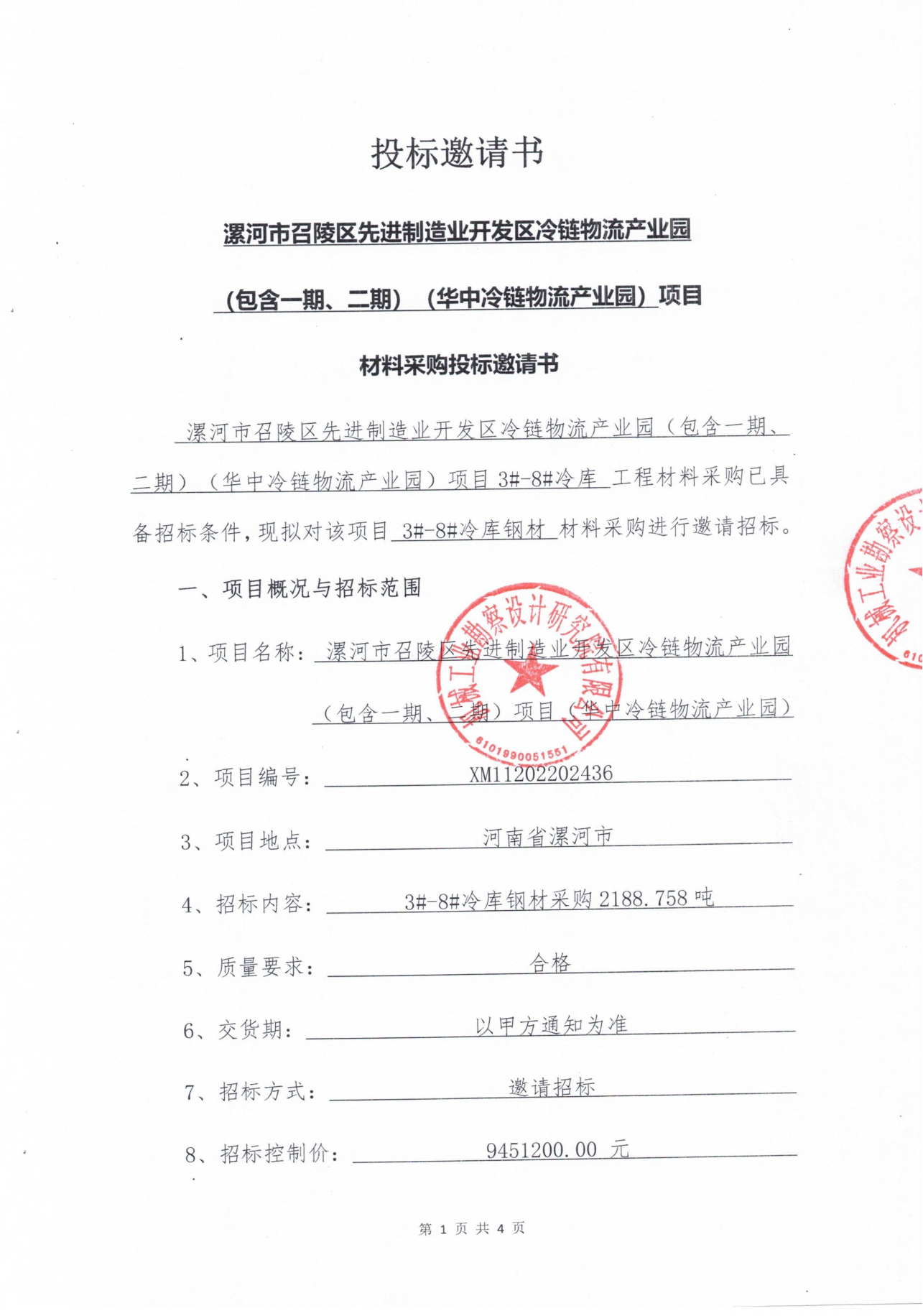 漯河市召陵区先进制造业开发区冷链物流产业园(包含一期、二期)(华中冷链物流产业园)项目材料采购投标邀请书