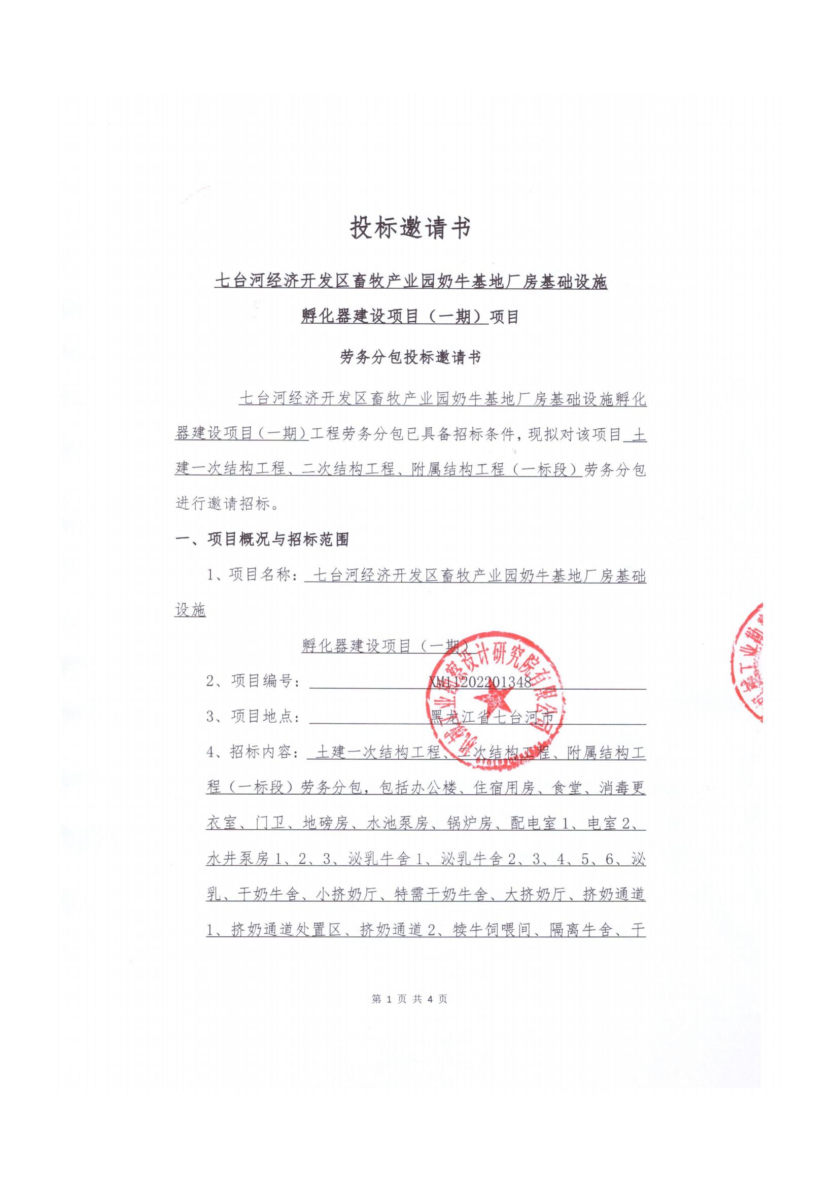 七台河经济开发区畜牧产业园奶牛基地厂房基础设施孵化器建设项目(一期)土建一次结构、二次结构劳务分包招标公告