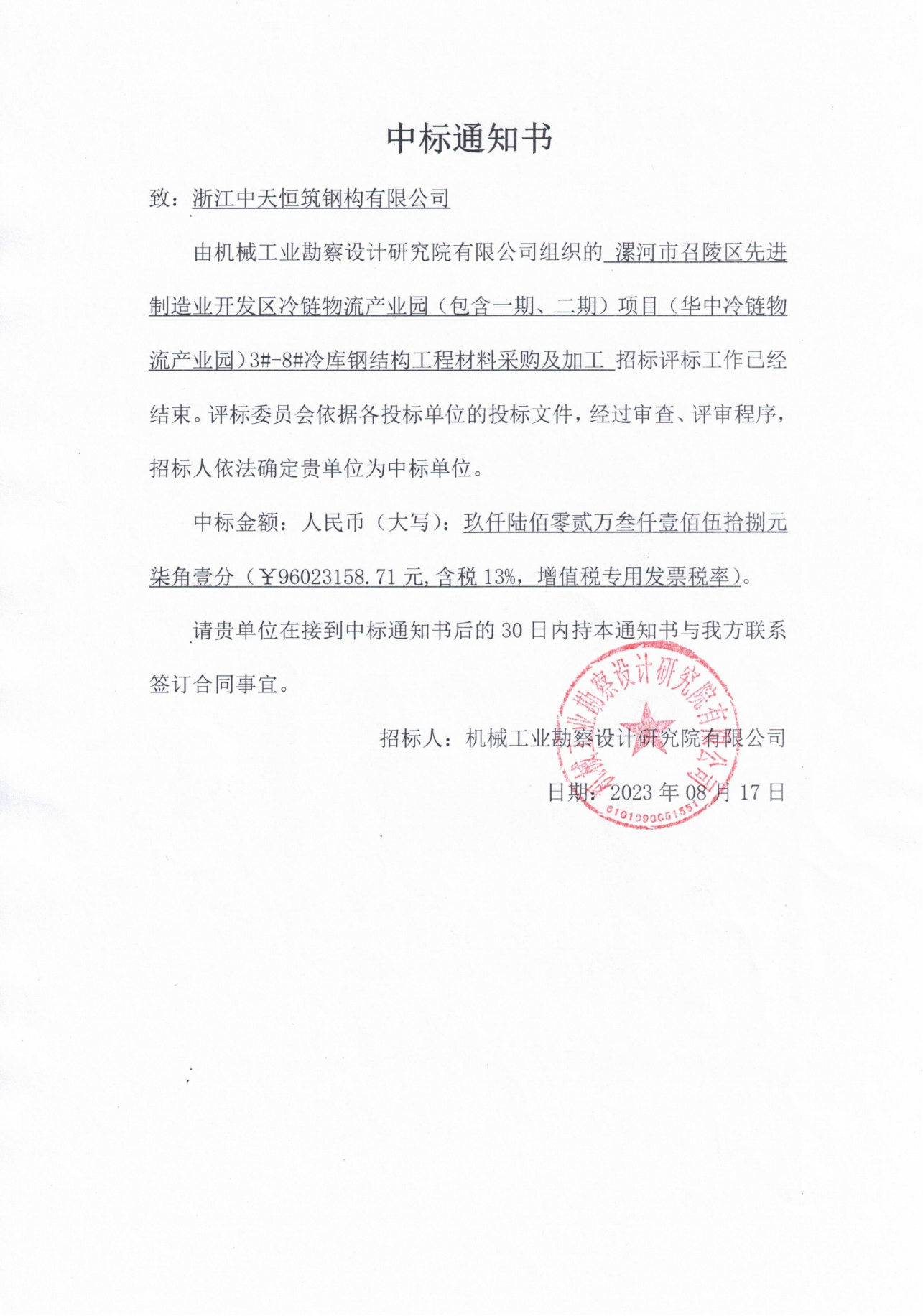 漯河市召陵区先进制造业开发区冷链物流产业园(包含一期、二期)项目(华中冷链物流产业园)钢结构采购及加工中标通知书