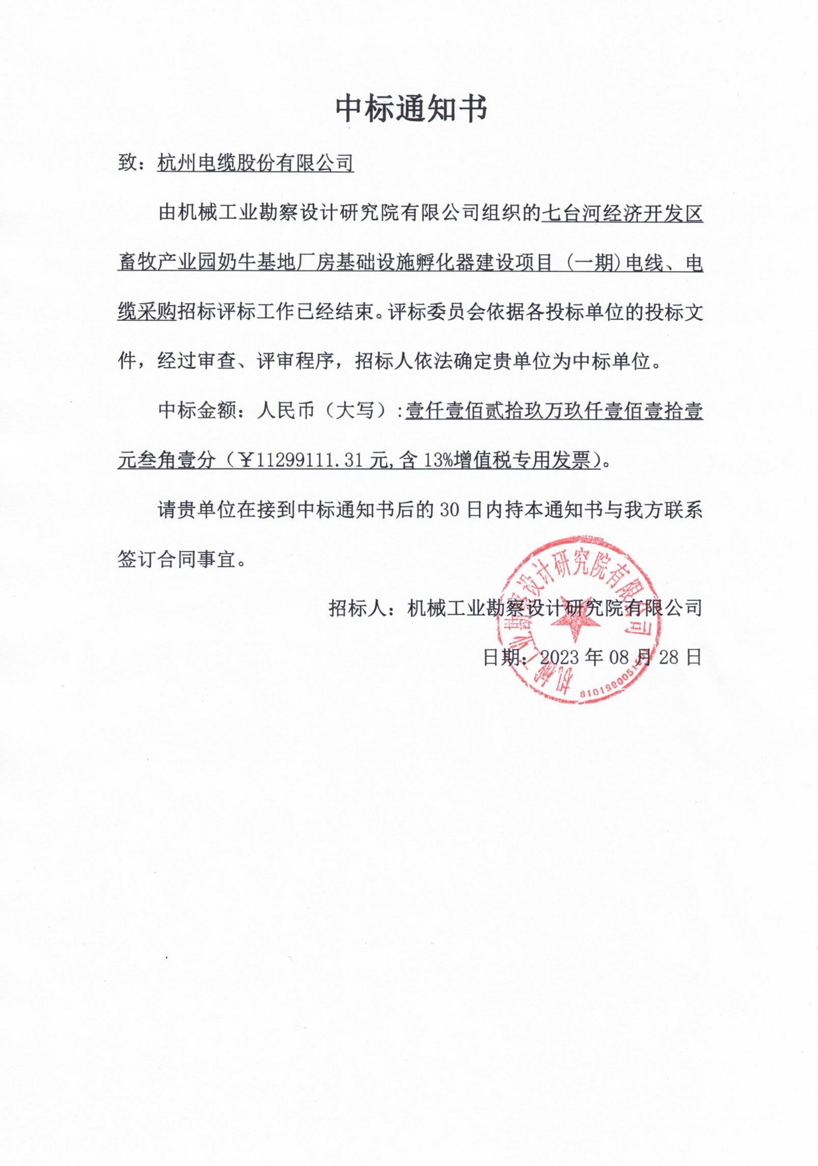 七台河经济开发区畜牧产业园奶牛基地厂房基础设施孵化器建设项目 (一期) 电线、电缆采购中标通知书