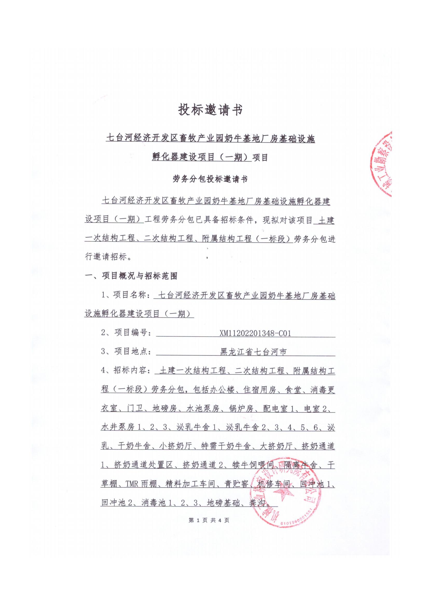 七台河经济开发区畜牧产业园奶牛基地厂房基础设施孵化器建设项目(一期)土建一次结构、二次结构劳务分包投标邀请书