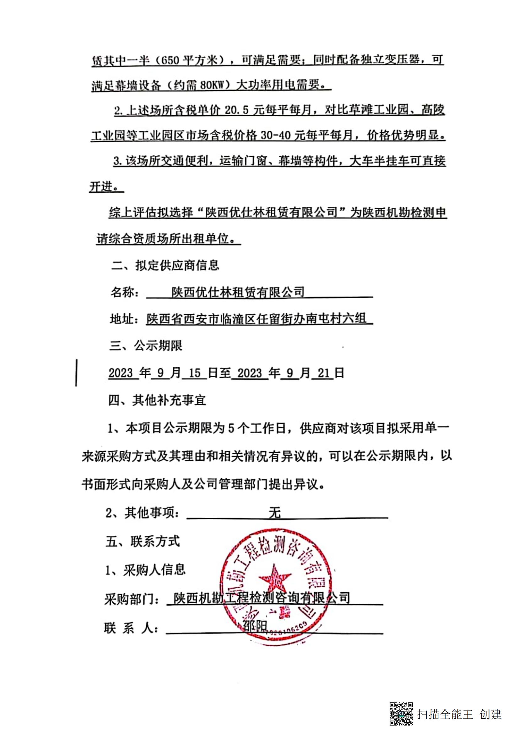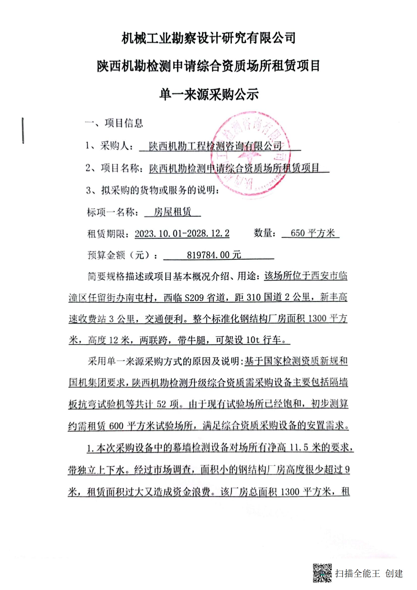 陕西机检测申请综合资质场所租赁项目单一来源采购公示