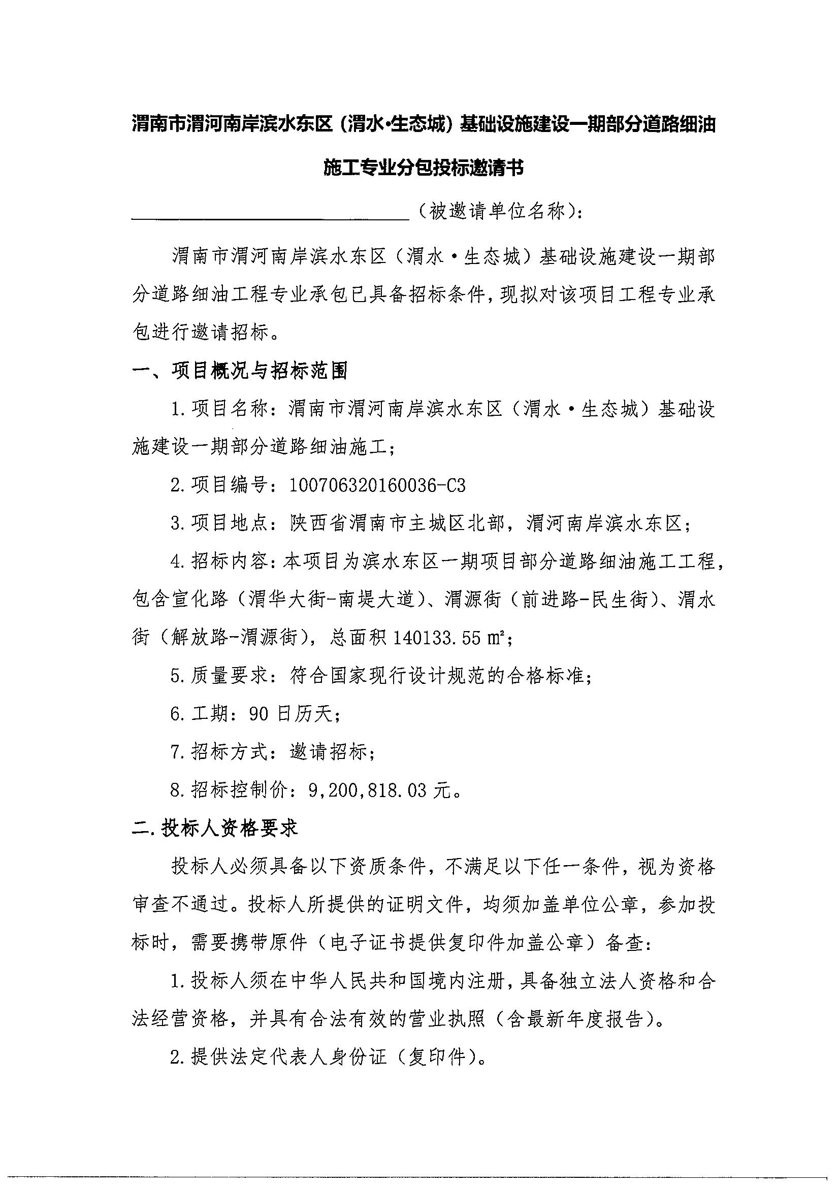 渭南市渭河南岸滨水东区基础设施建设一期工程部分道路细油施工-投标邀请书