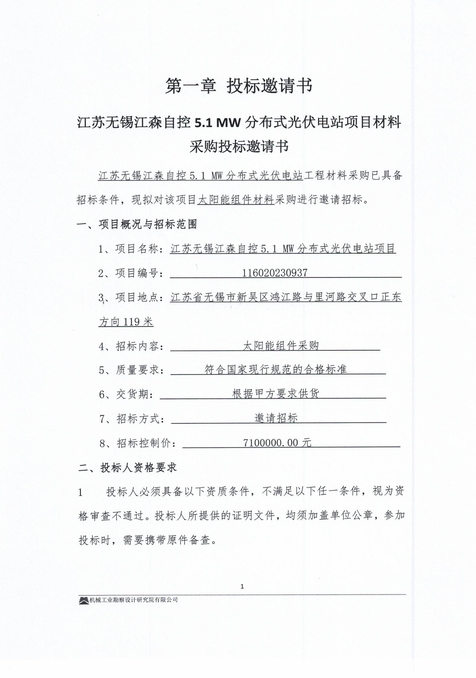 江苏无锡江森自控5.1 MW分布式光伏电站项目-投标邀请书