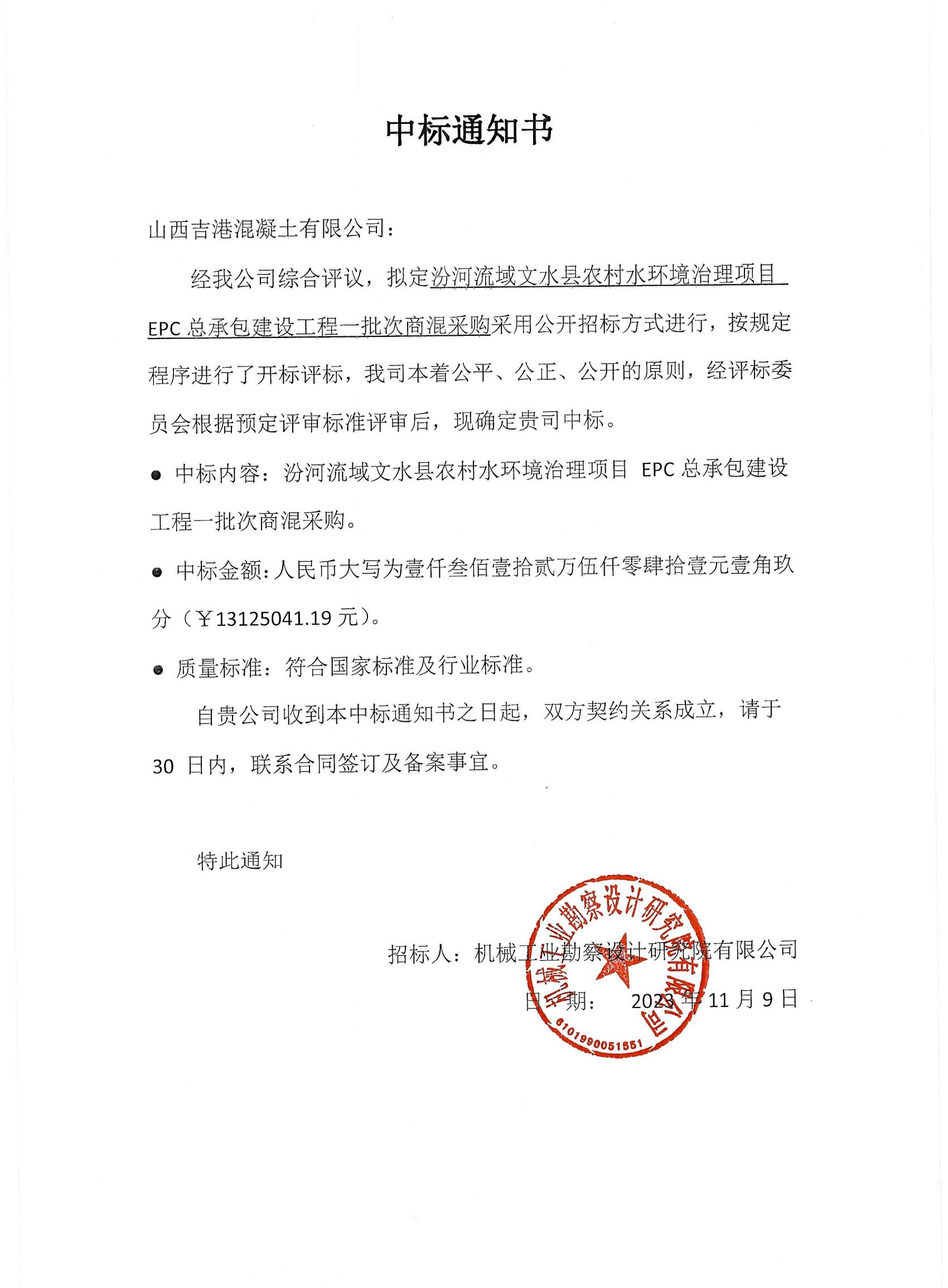 汾河流域文水县农村水环境治理项目EPC总承包建设工程一批次商混采购中标通知书