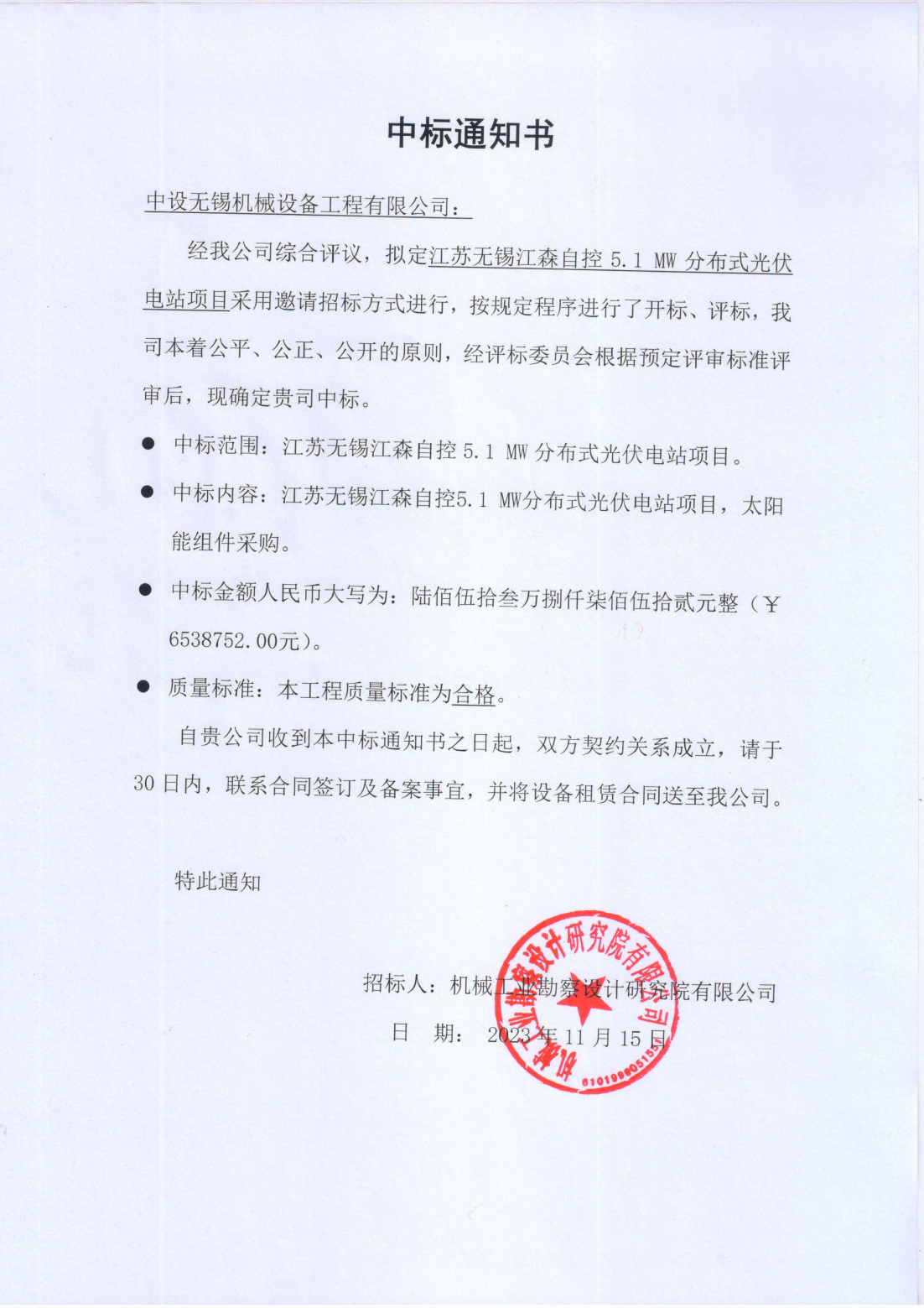 江苏无锡江森自控5.1 MW分布式光伏电站项目中标通知书