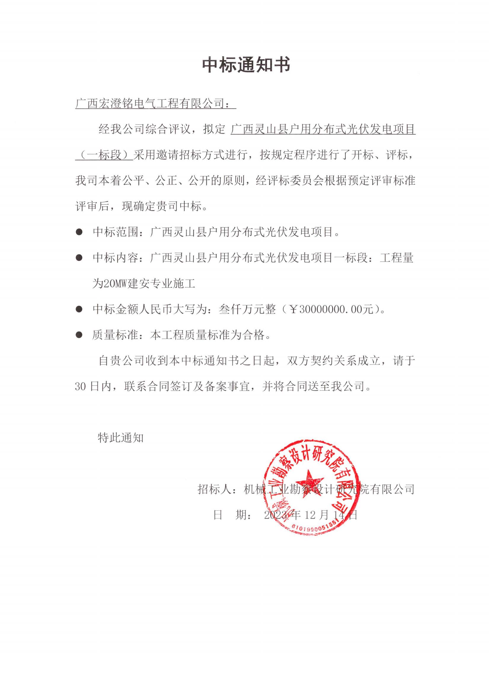 广西灵山县户用分布式光伏发电项目(一标段)中标通知书