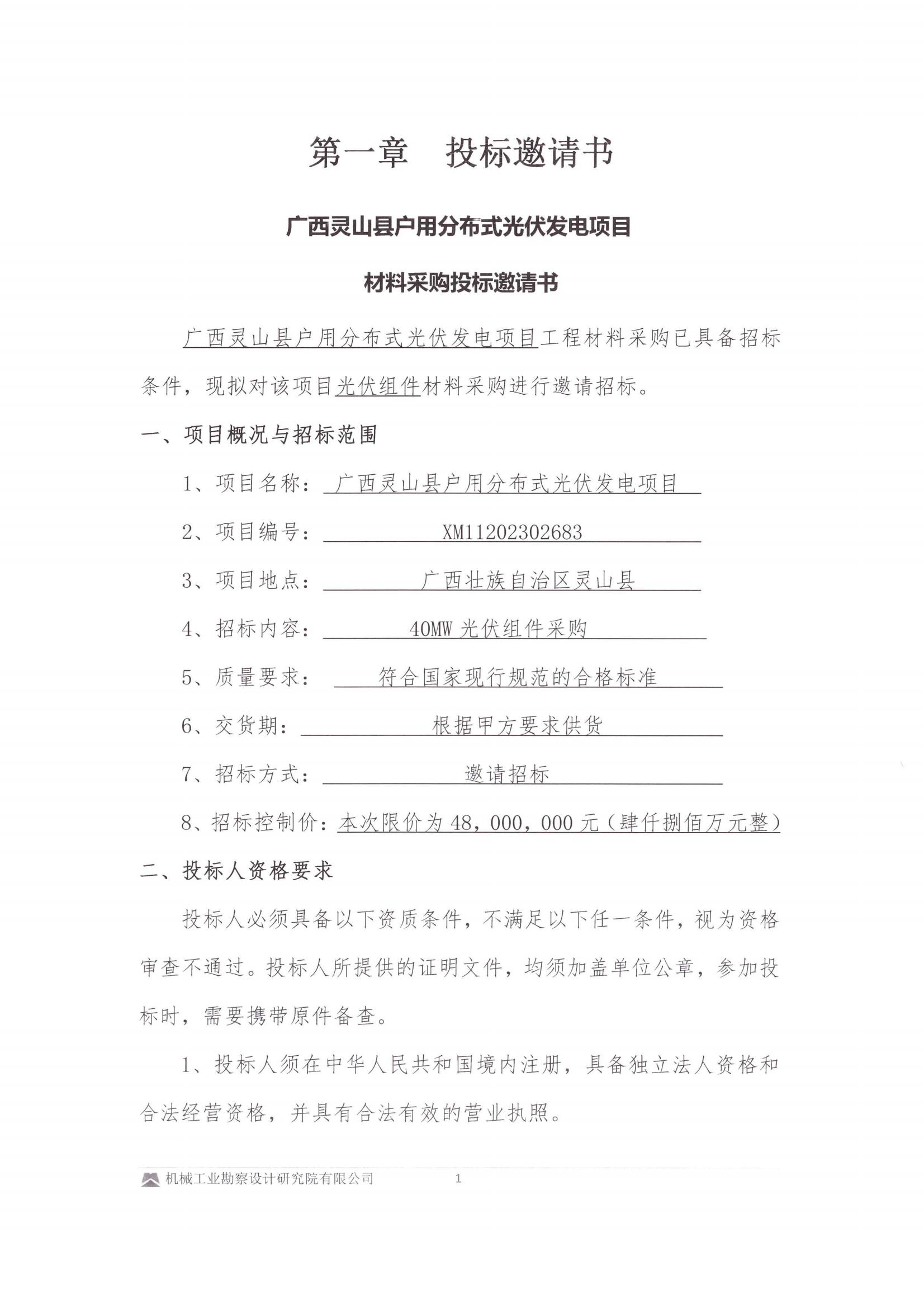 广西灵山县户用分布式光伏项目建设工程光伏组件采购-投标邀请书