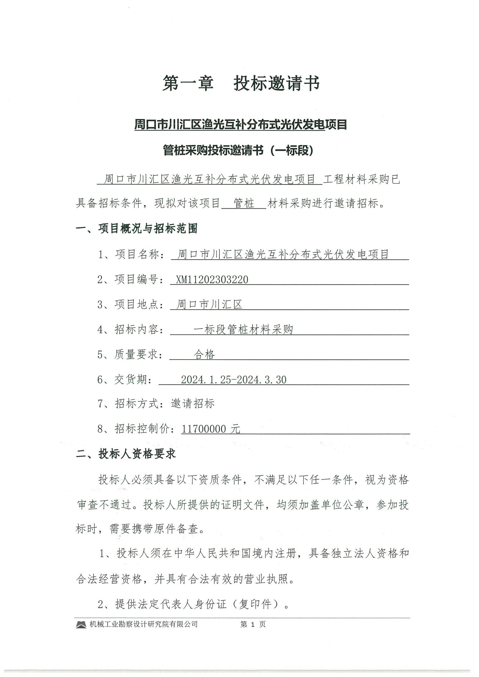 周口市川汇区渔光互补分布式光伏发电项目建设工程管桩材料采购招标文件(一标段)投标邀请书