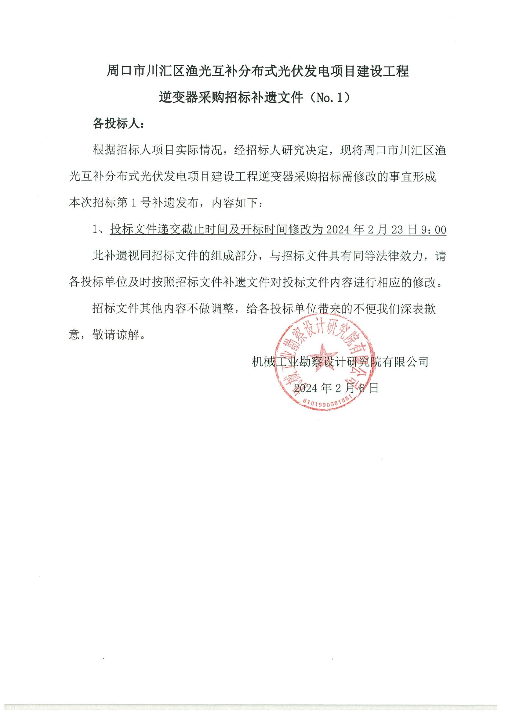 周口市川汇区渔光互补分布式光伏发电项目建设工程逆变器采购招标补遗文件