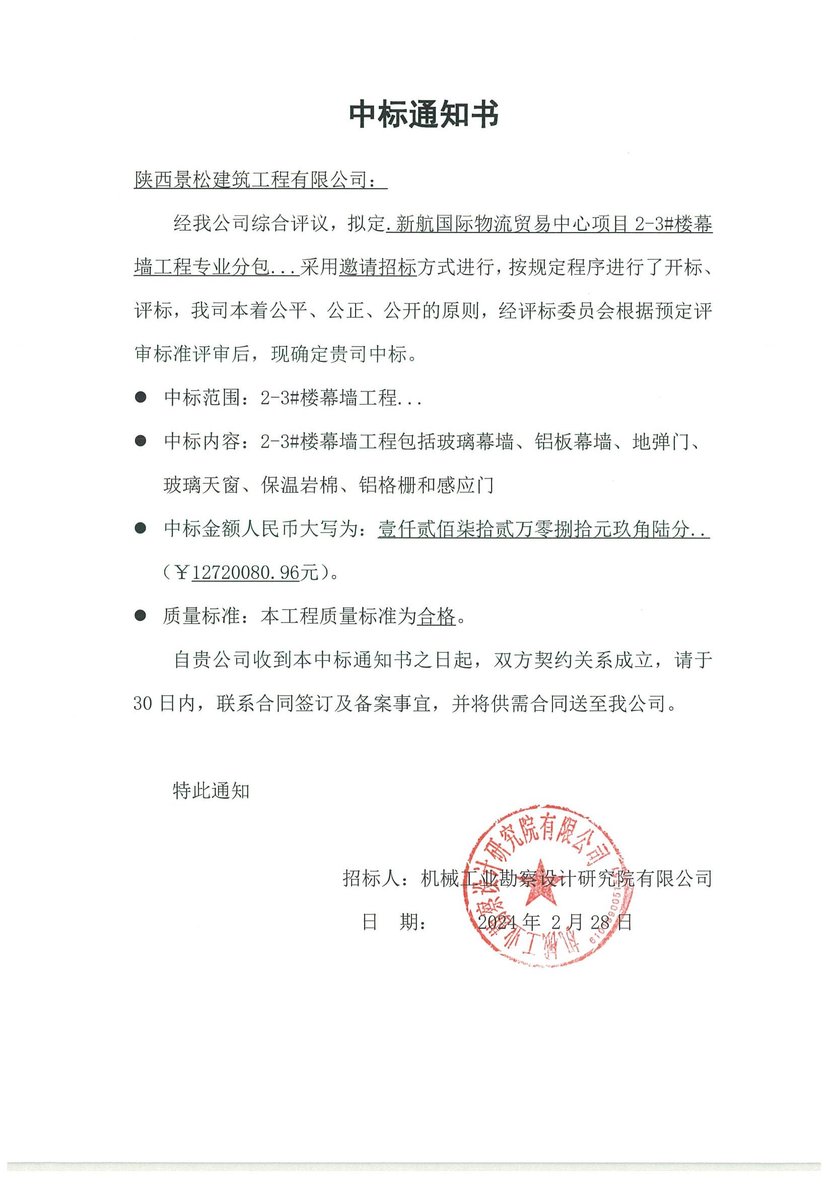 新航国际物流贸易中心项目 2-3#楼幕墙工程专业分包中标通知书