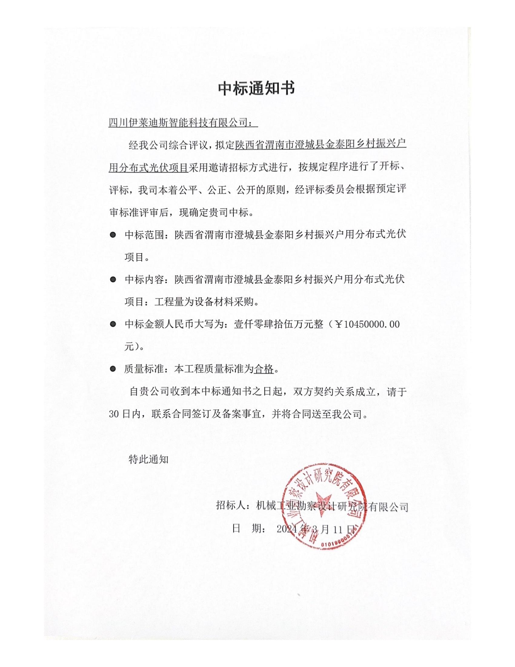 陕西省渭南市澄城县金泰阳乡村振兴户用分布式光伏项目建设工程材料采购中标通知书