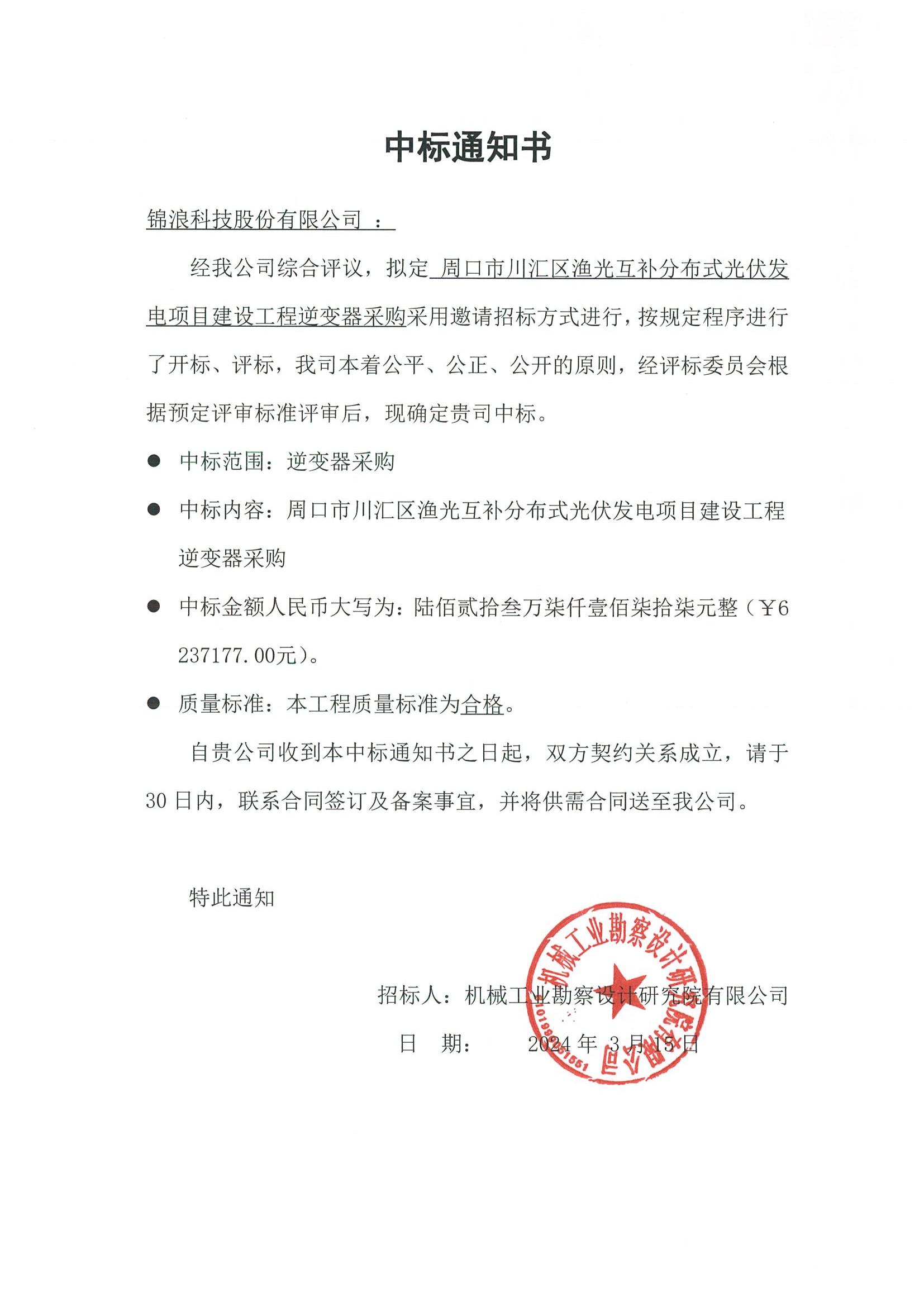 周口市川汇区渔光互补分布式光伏发电项目建设工程逆变器采购中标通知书