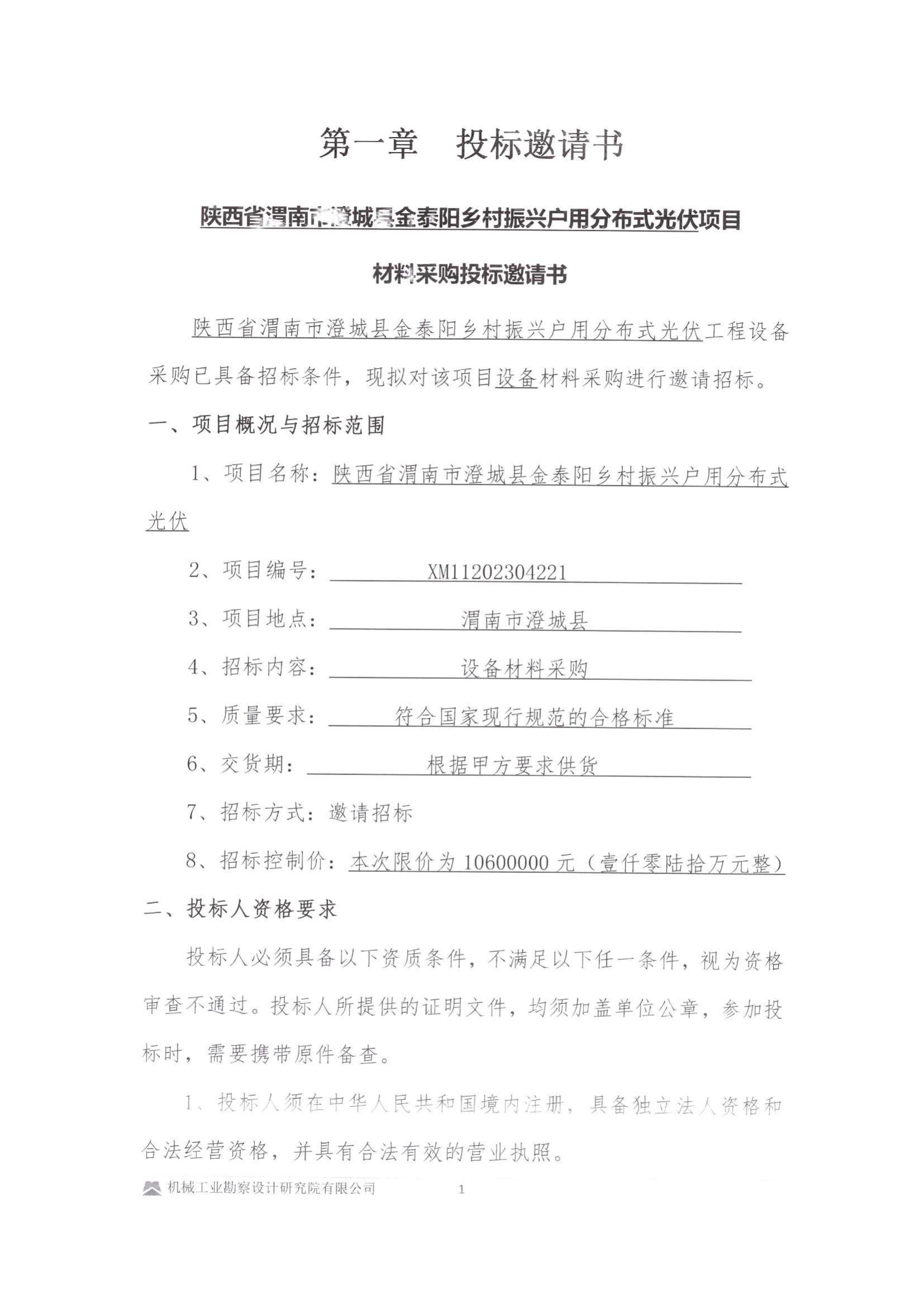 陕西省渭南市澄城县金泰阳乡村振兴户用分布式光伏项目-投标邀请书