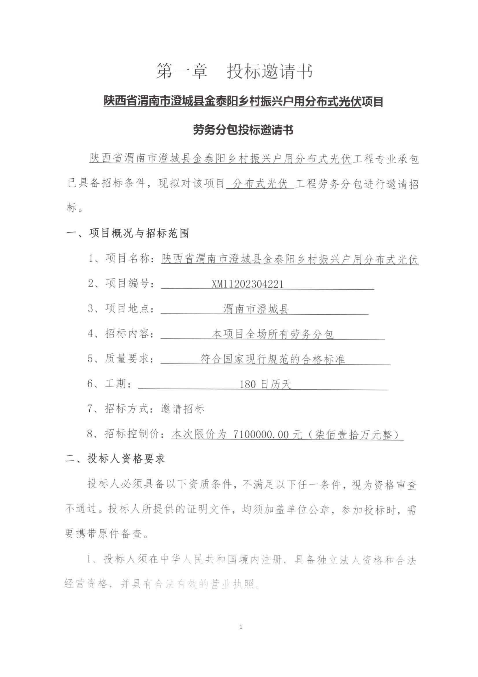 陕西省渭南市澄城县金泰阳乡村振兴户用分布式光伏项目-投标邀请书