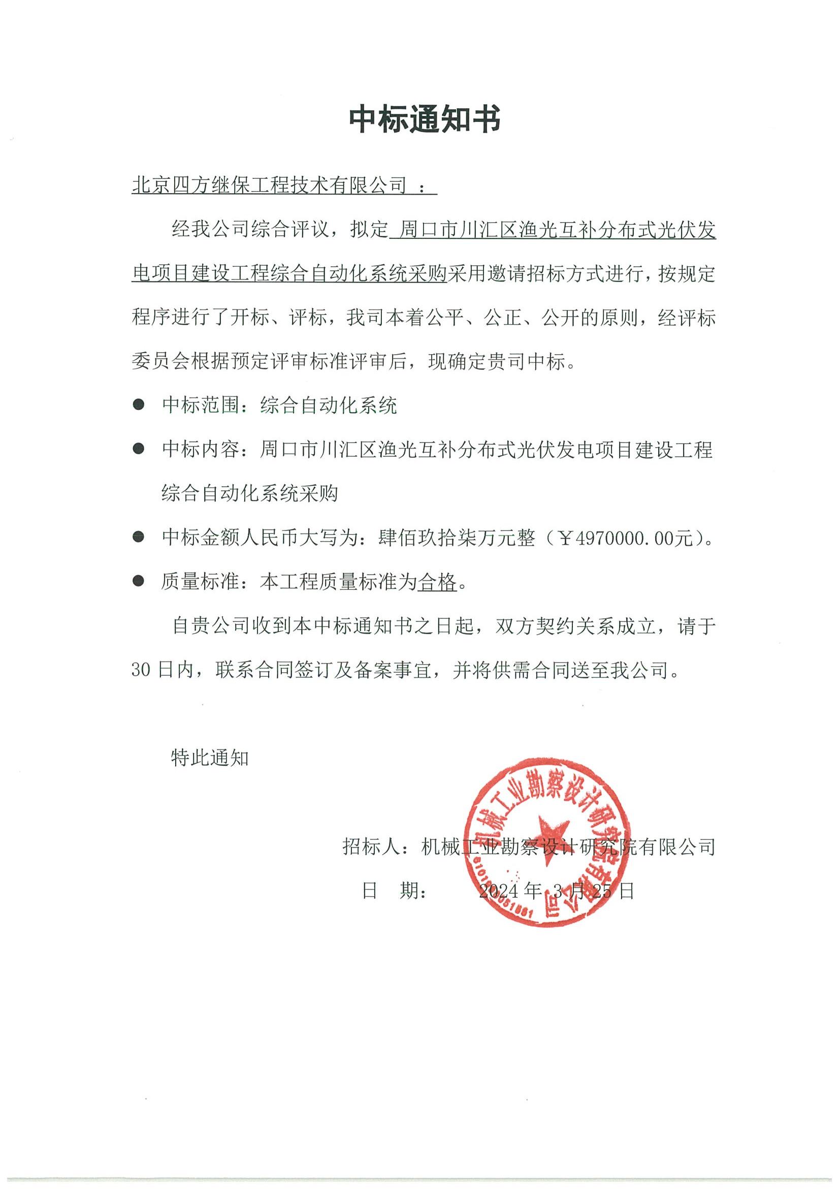 周口市川汇区渔光互补分布式光伏发电项目建设工程综合自动化系统采购招标中标通知书