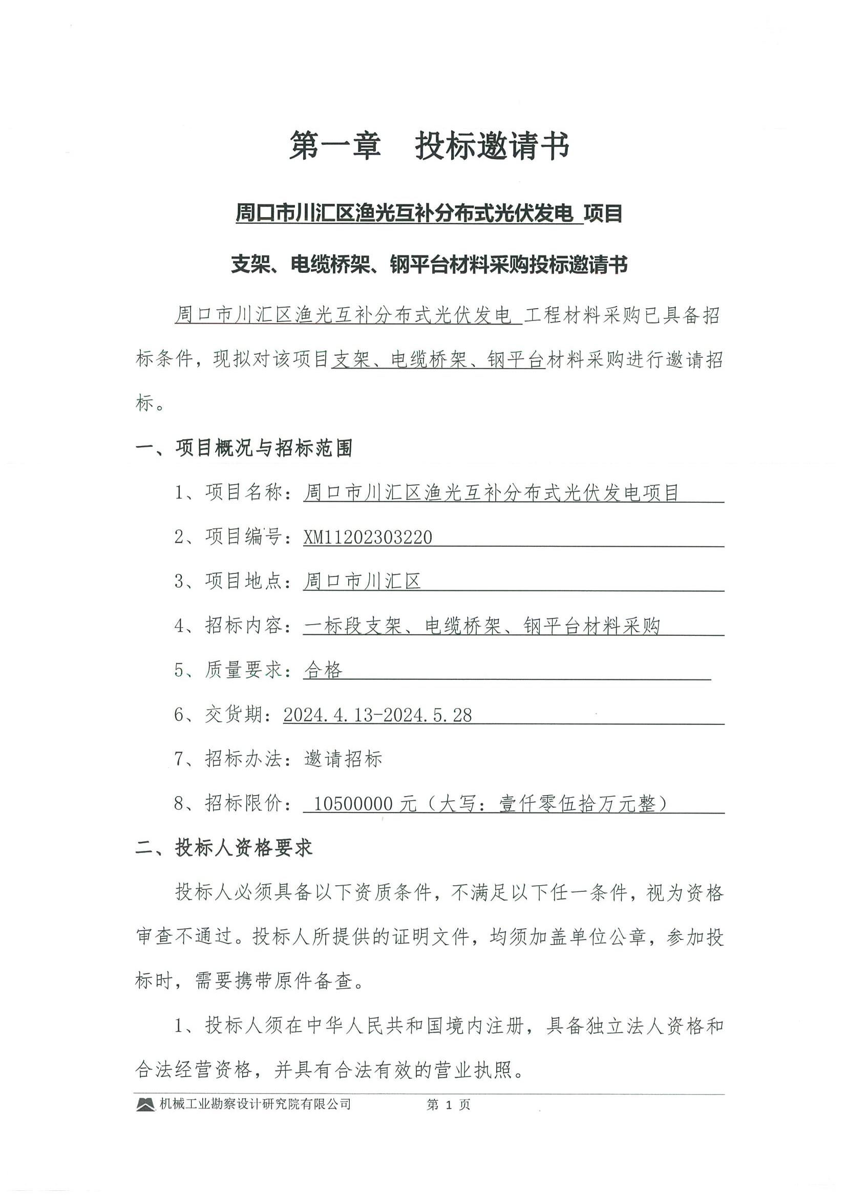 周口市川汇区渔光互补分布式光伏发电项目建设工程支架、电缆桥架、钢平台材料采购投标邀请书