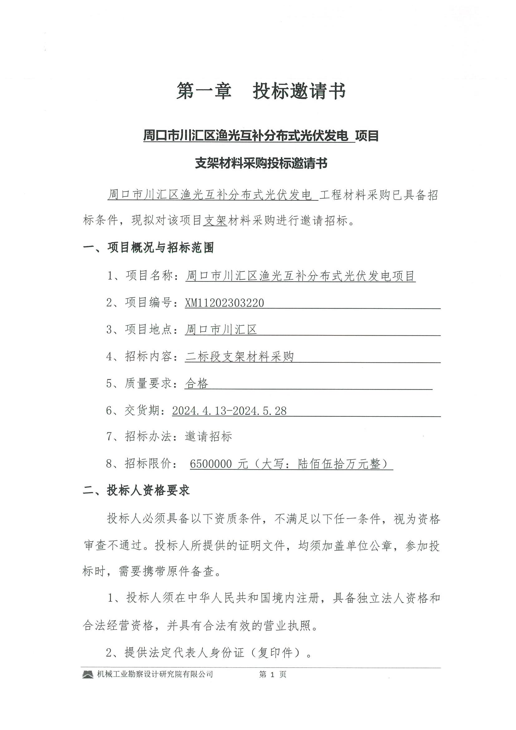 周口市川汇区渔光互补分布式光伏发电项目建设工程支架材料采购投标邀请书
