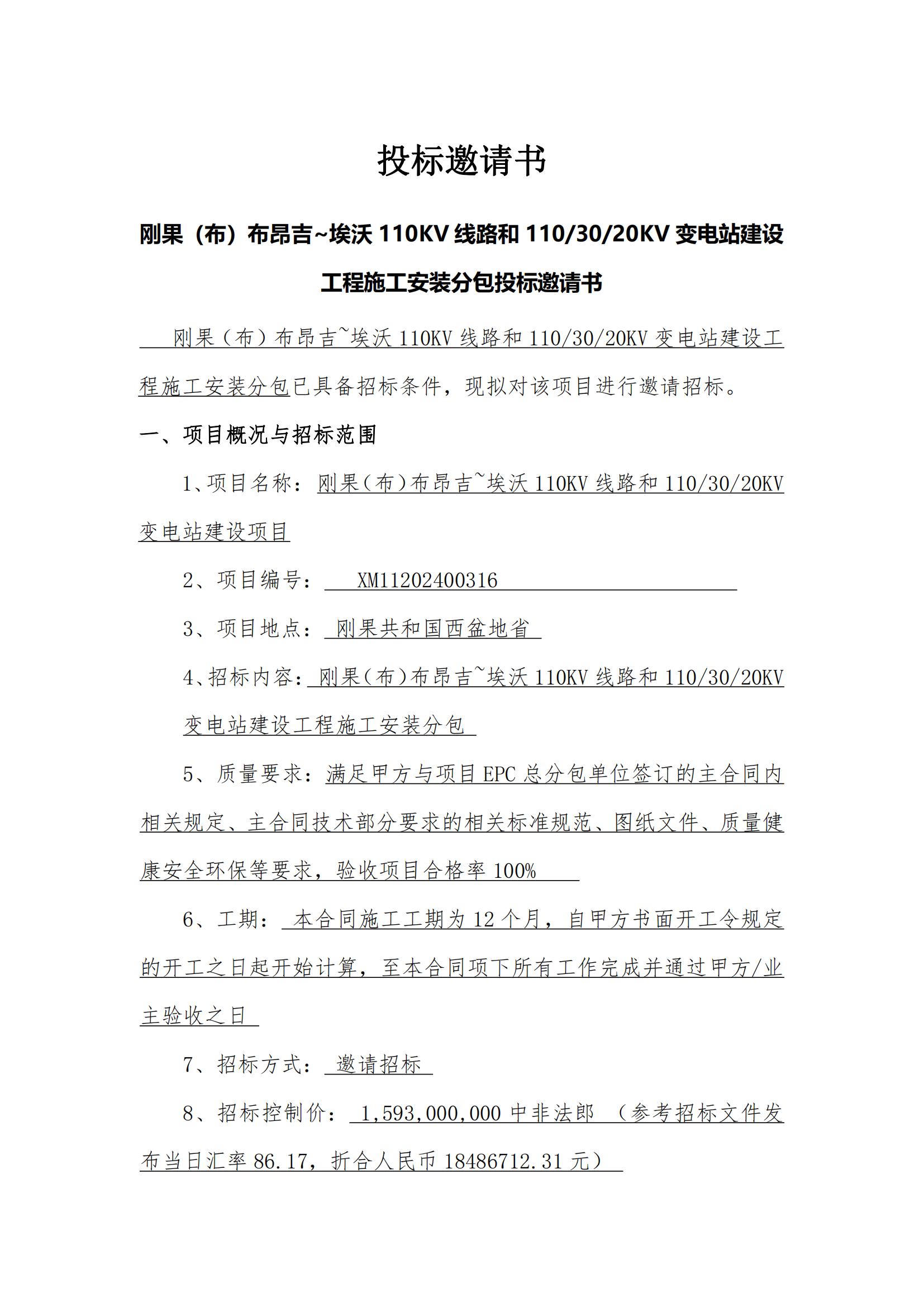 刚果(布)布昂吉~埃沃110KV线路和1103020KV变电站建设工程施工安装分包-投标邀请书