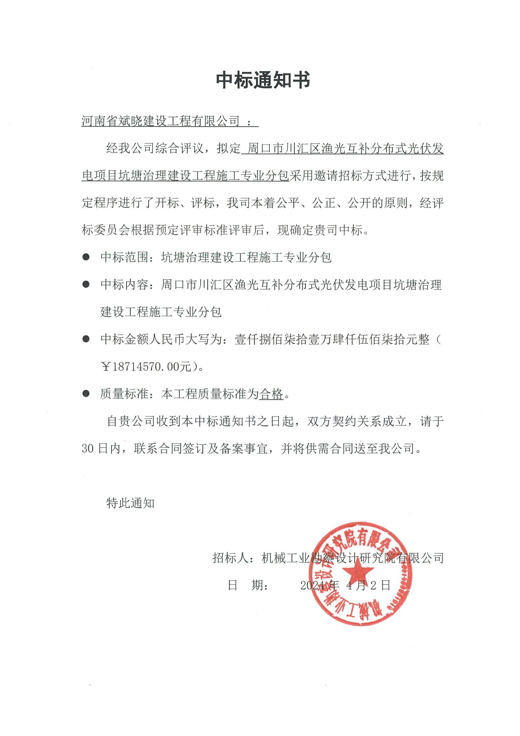 周口市川汇区渔光互补分布式光伏发电项目坑塘治理建设工程施工专业分包中标通知书