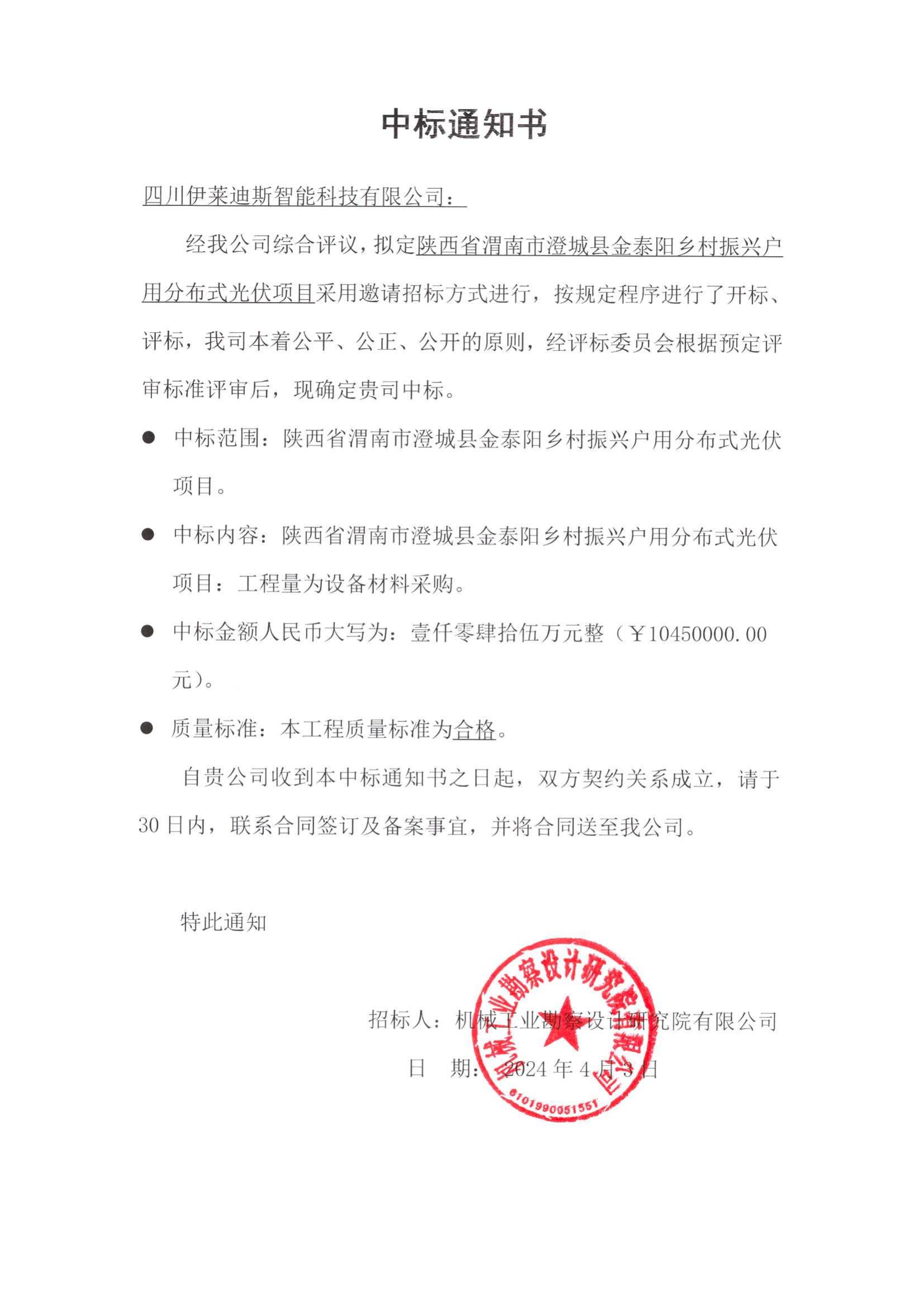 陕西省渭南市澄城县金泰阳乡村振兴户用分布式光伏项目建设工程材料采购招标文件中标通知书