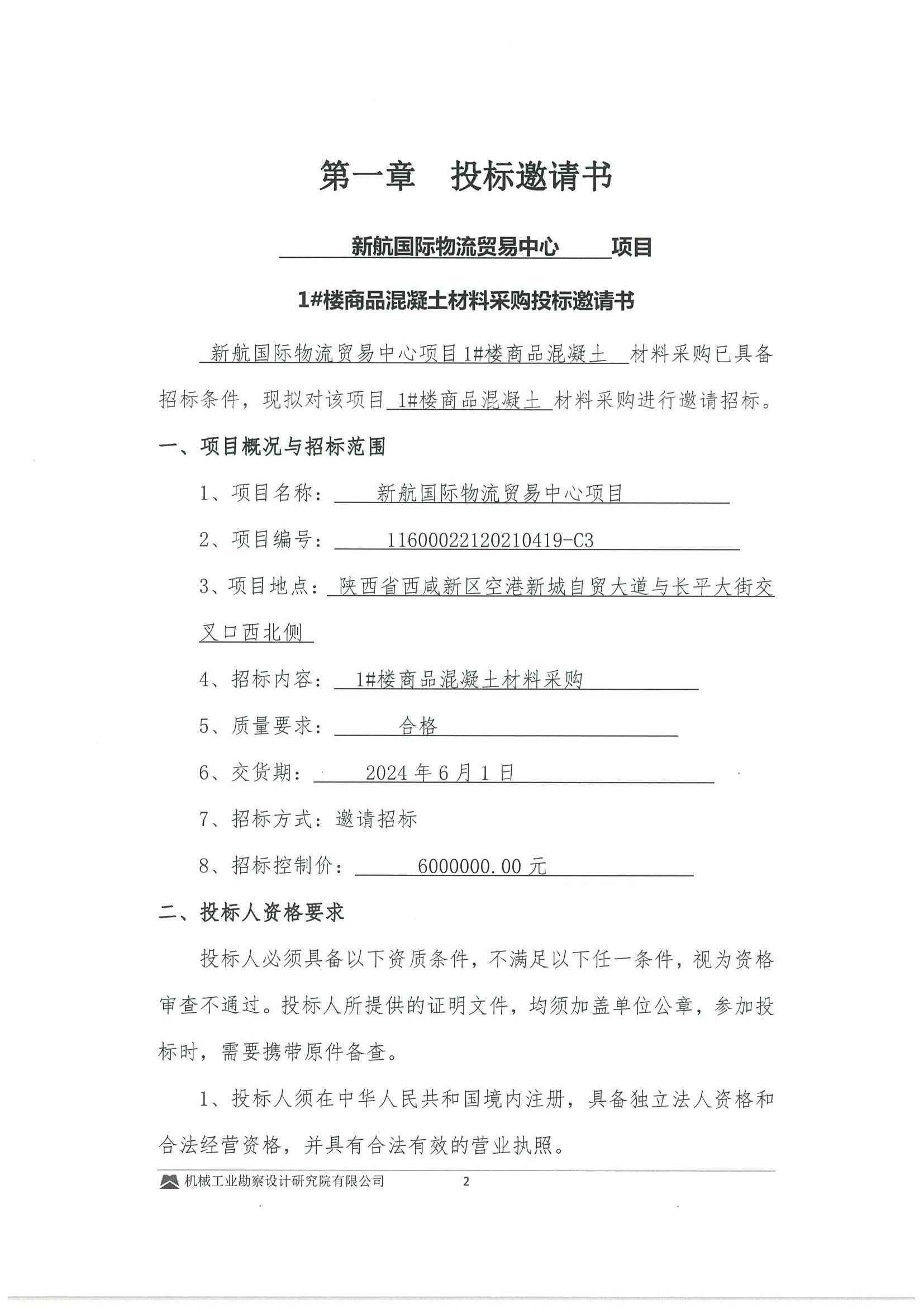 新航国际物流贸易中心项目-1#混凝土材料投标邀请书