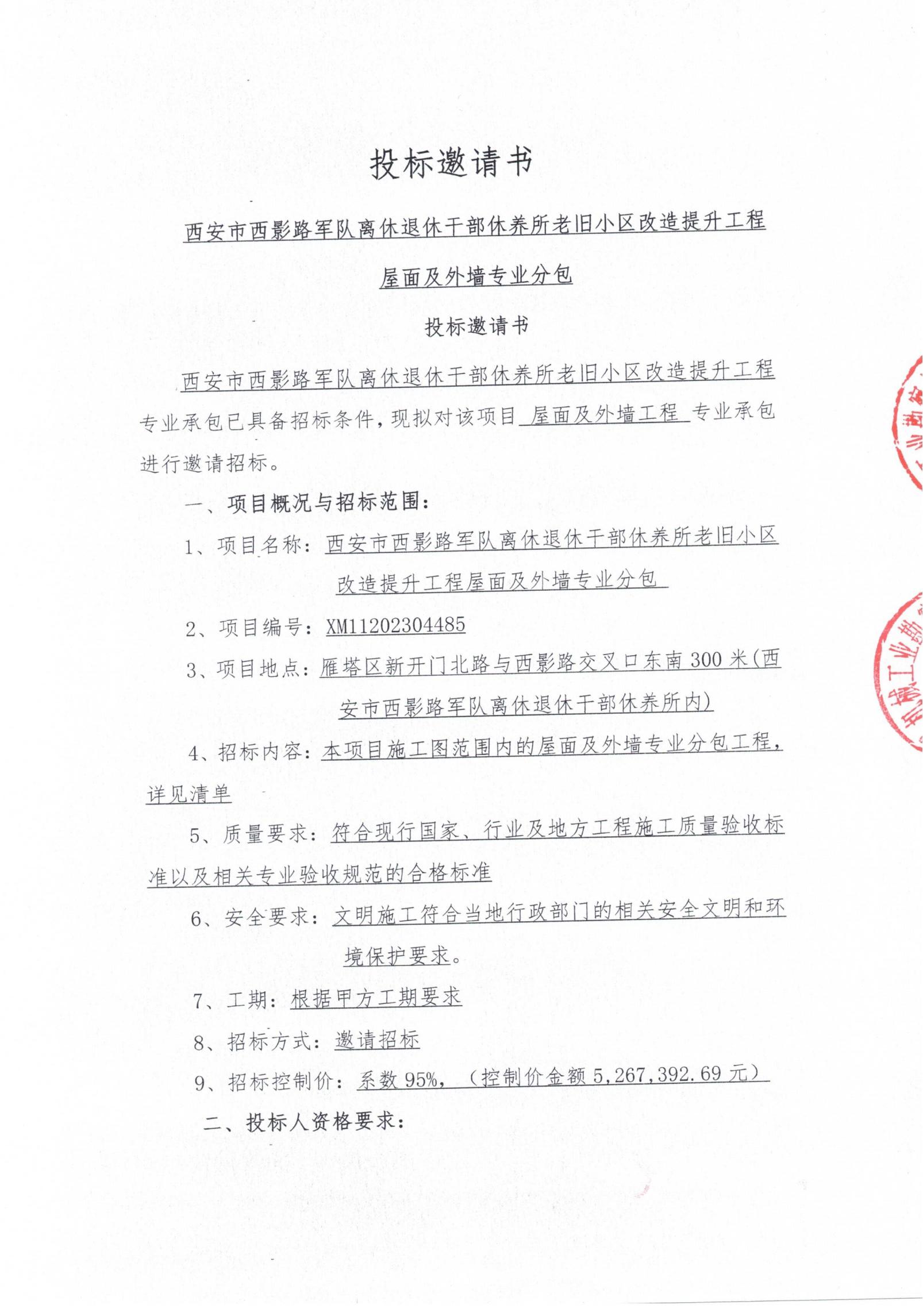 西安市西影路军队离休退休干部休养所老旧小区改造提升工程屋面及外墙专业分包投标邀请书