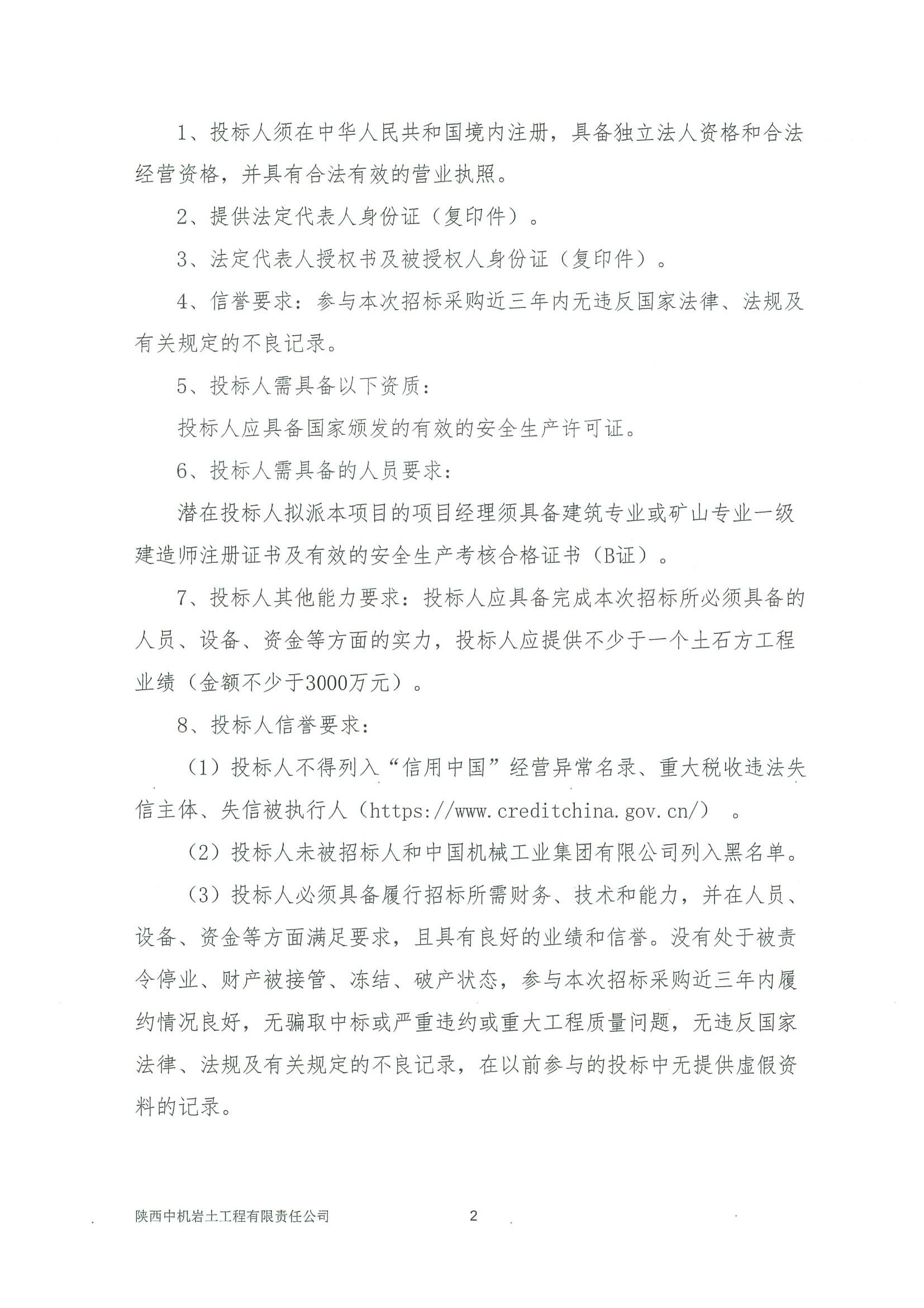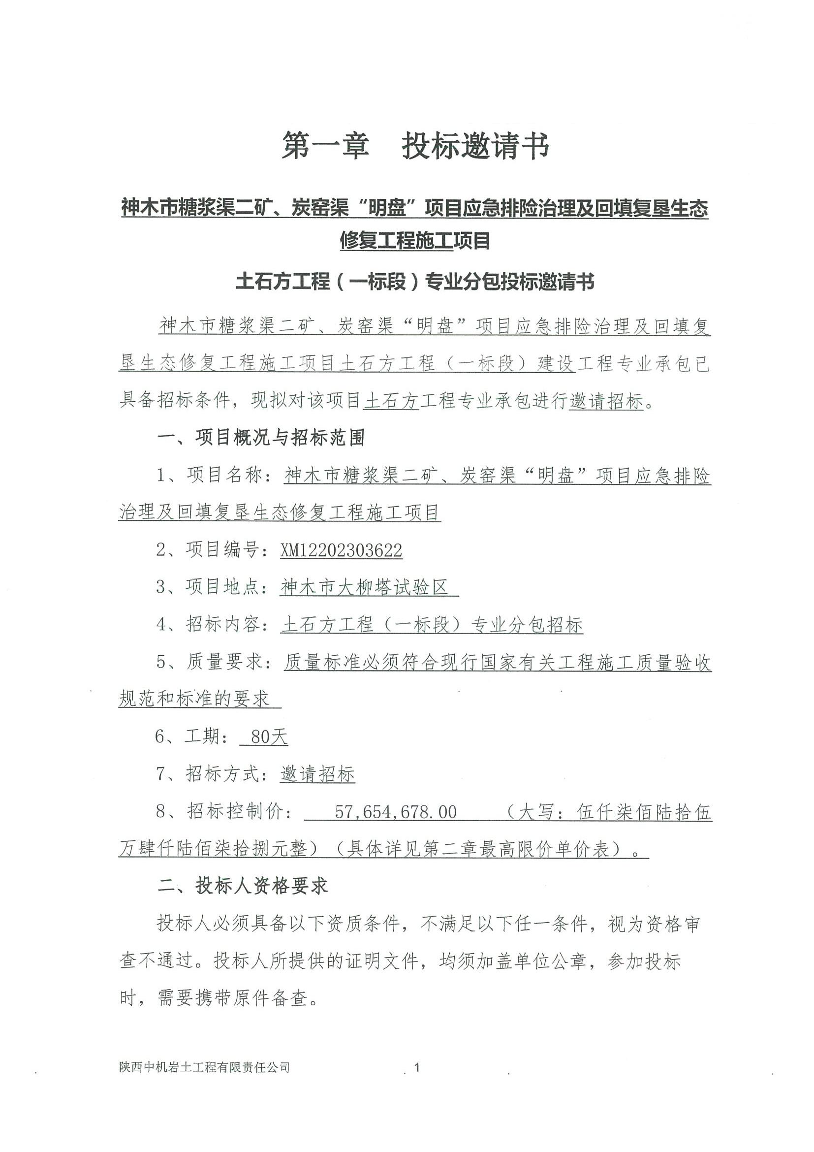 神木市糖浆渠二矿、炭窑渠“明盘”项目应急排险治理及回填复垦生态修复工程施工项目土石方工程(一标段)专业分包投标邀请书