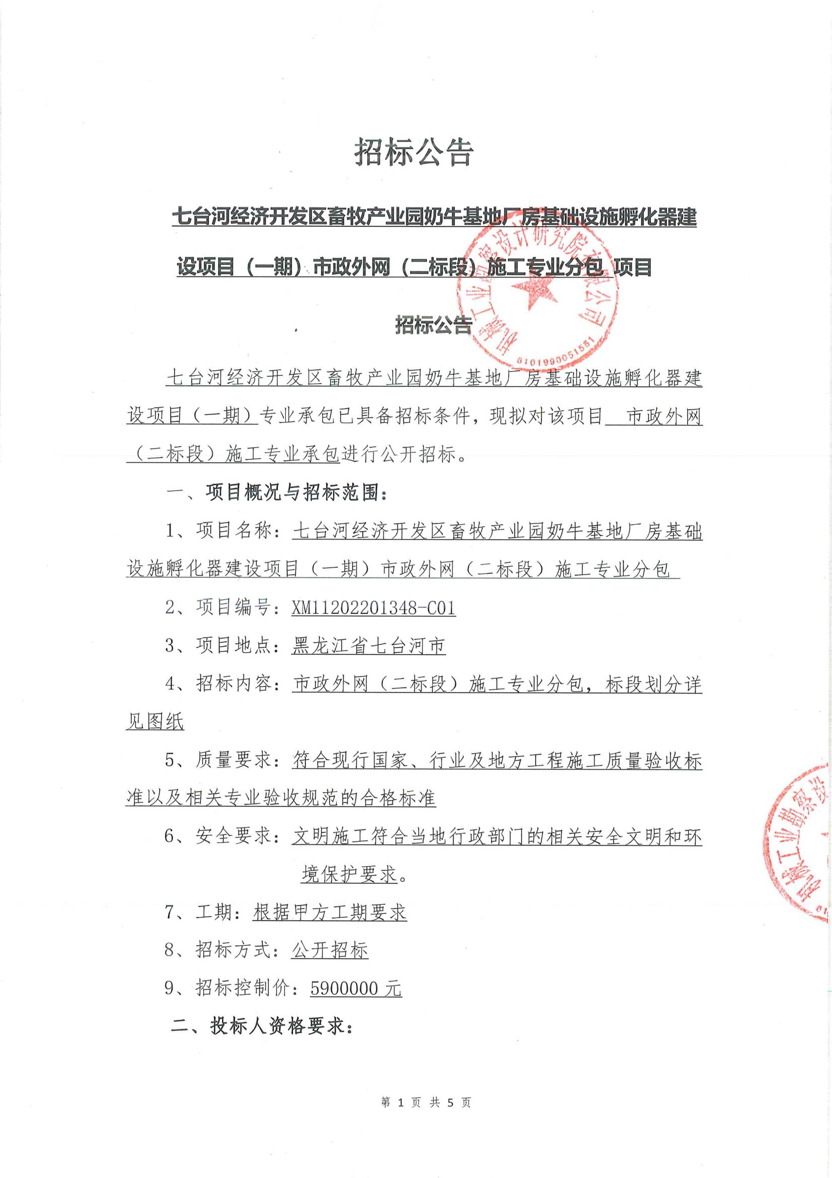 七台河经济开发区畜牧产业园奶牛基地厂房基础设施孵化器建设项目(一期)市政外网(二标段)施工专业分包招标公告