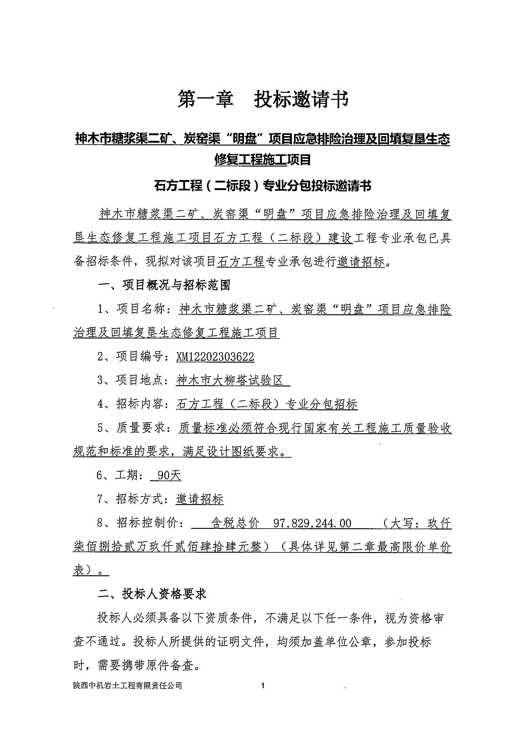 神木市糖浆渠二矿、炭窑渠“明盘”项目应急排险治理及回填复垦生态修复工程施工项目建设工程土石方工程(二标段)投标邀请书