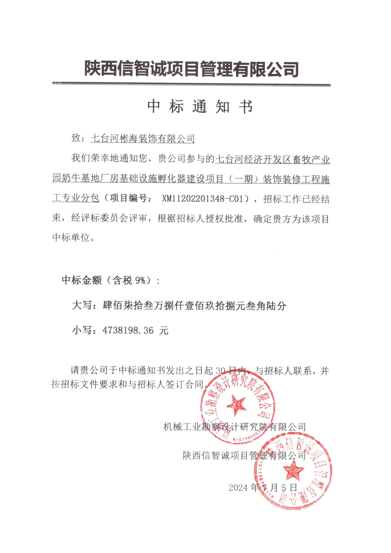七台河经济开发区畜牧产业园奶牛基地厂房基础设施孵化器建设项目(一期)EPC工程总承包装饰装修中标通知书
