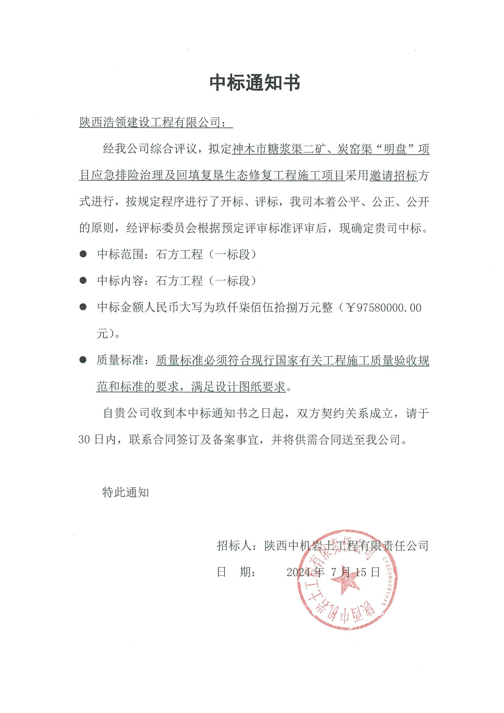 神木市糖浆渠二矿、炭窑渠“明盘”项目应急排险治理及回填复垦生态修复工程施工项目建设工程 土石方工程(一标段)中标通知书