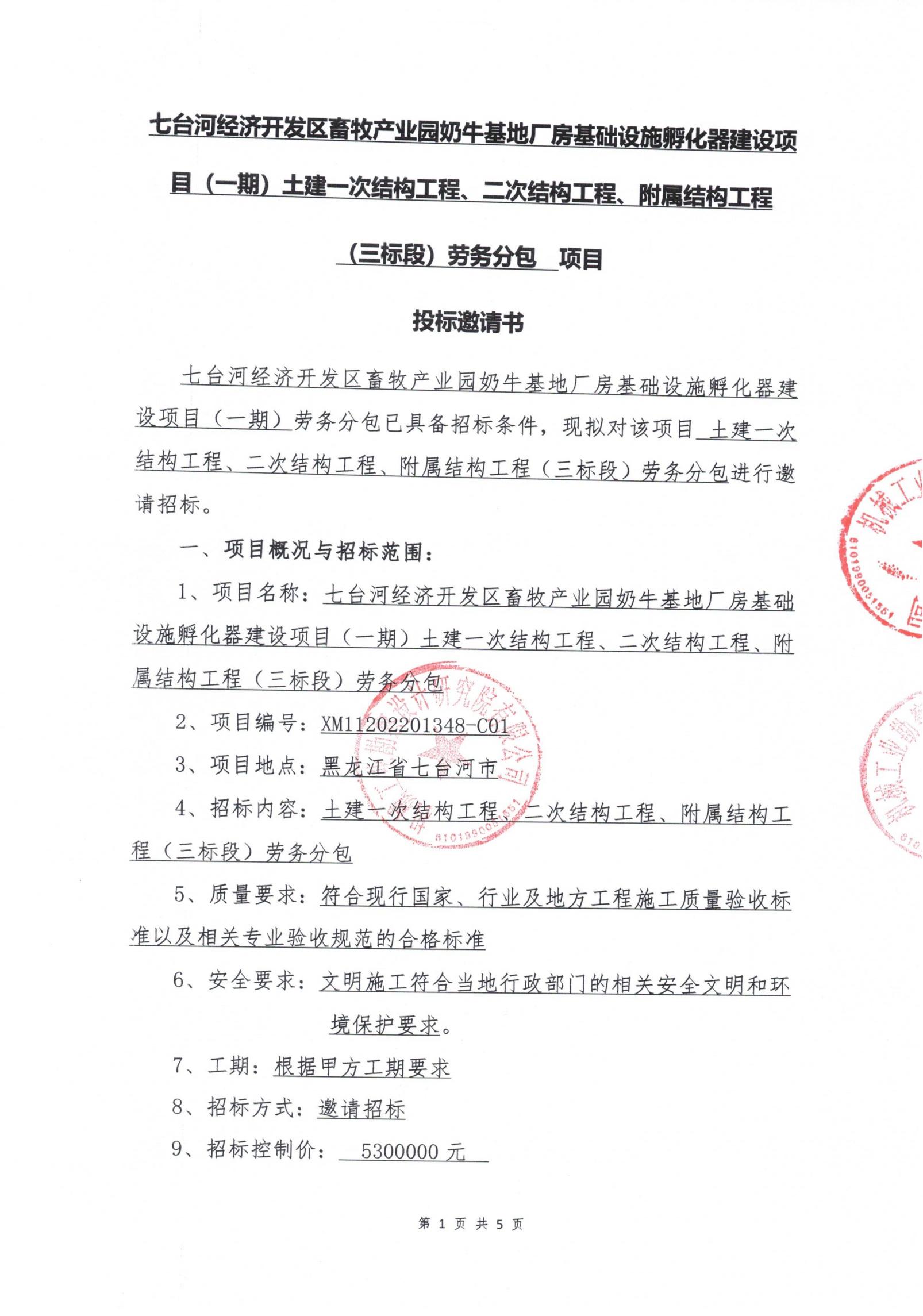 七台河经济开发区畜牧产业园奶牛基地厂房基础设施孵化器建设项目(一期)土建一次结构工程、二次结构工程、附属结构工程(三标段)劳务分包投标邀请书