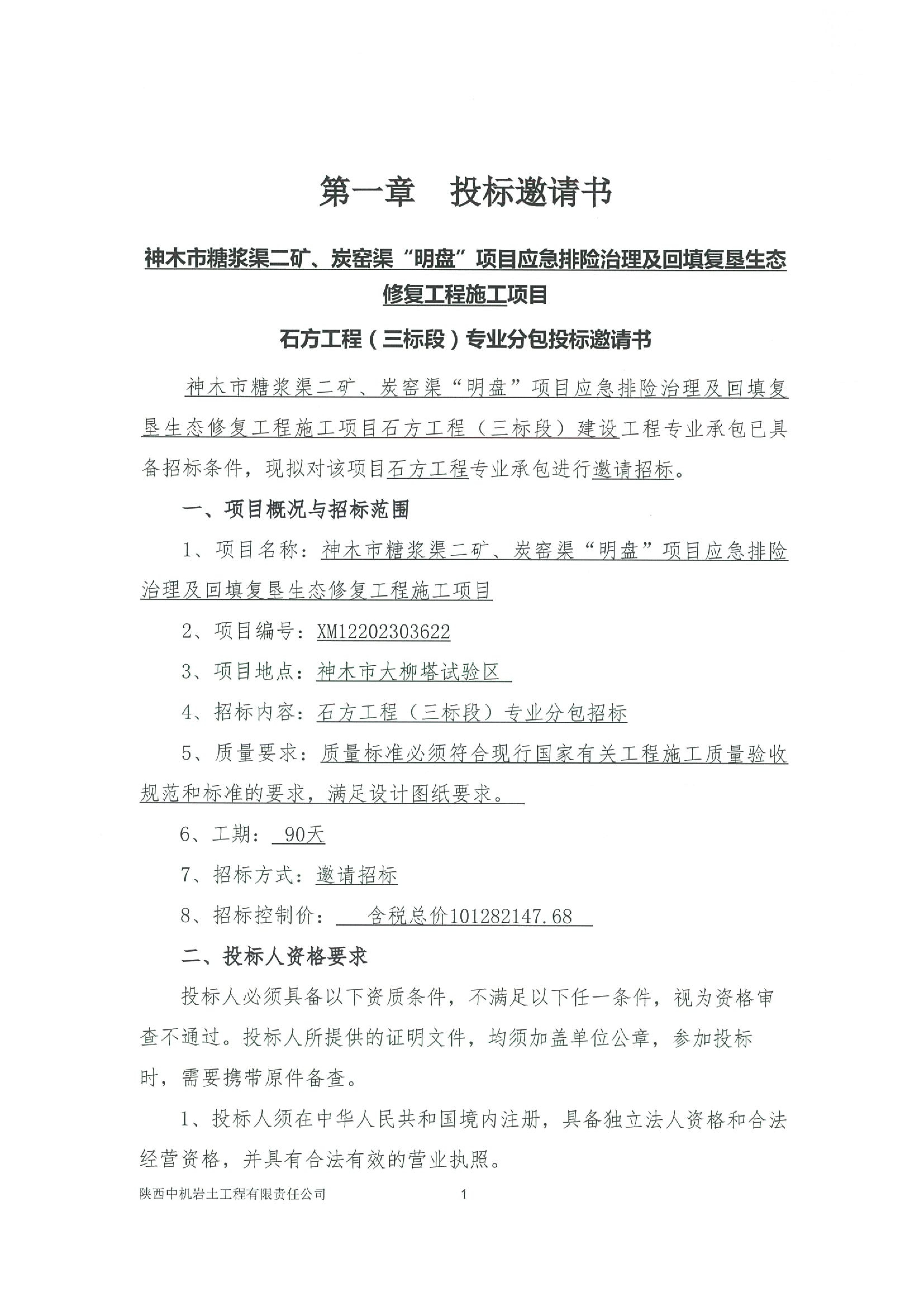 神木市糖浆渠二矿、炭窑渠“明盘”项目应急排险治理及回填复垦生态修复工程施工项目建设工程 土石方工程(三标段)投标邀请书
