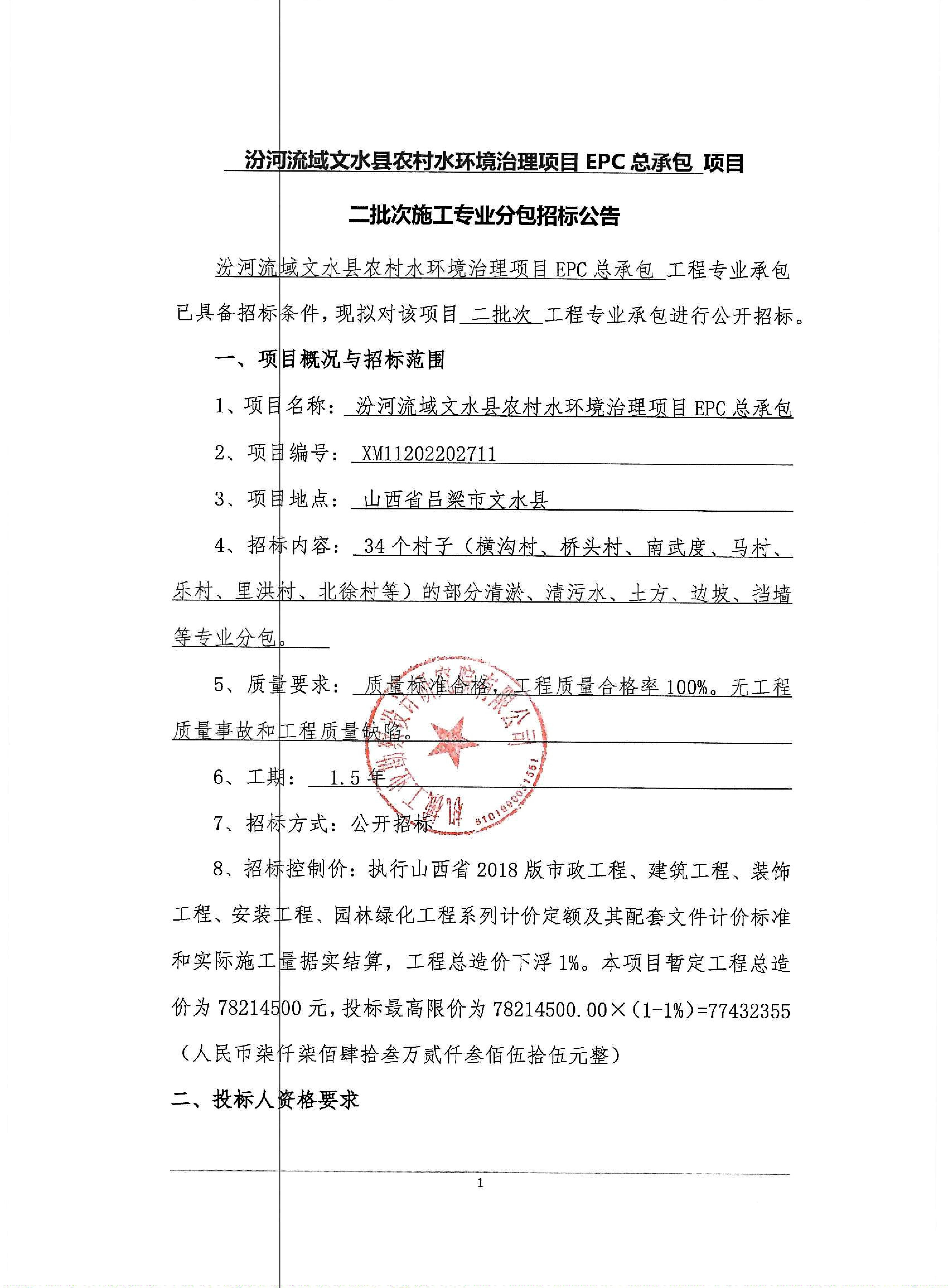 汾河流域文水县农村水环境治理项目EPC总承包二批次施工专业分包招标公告