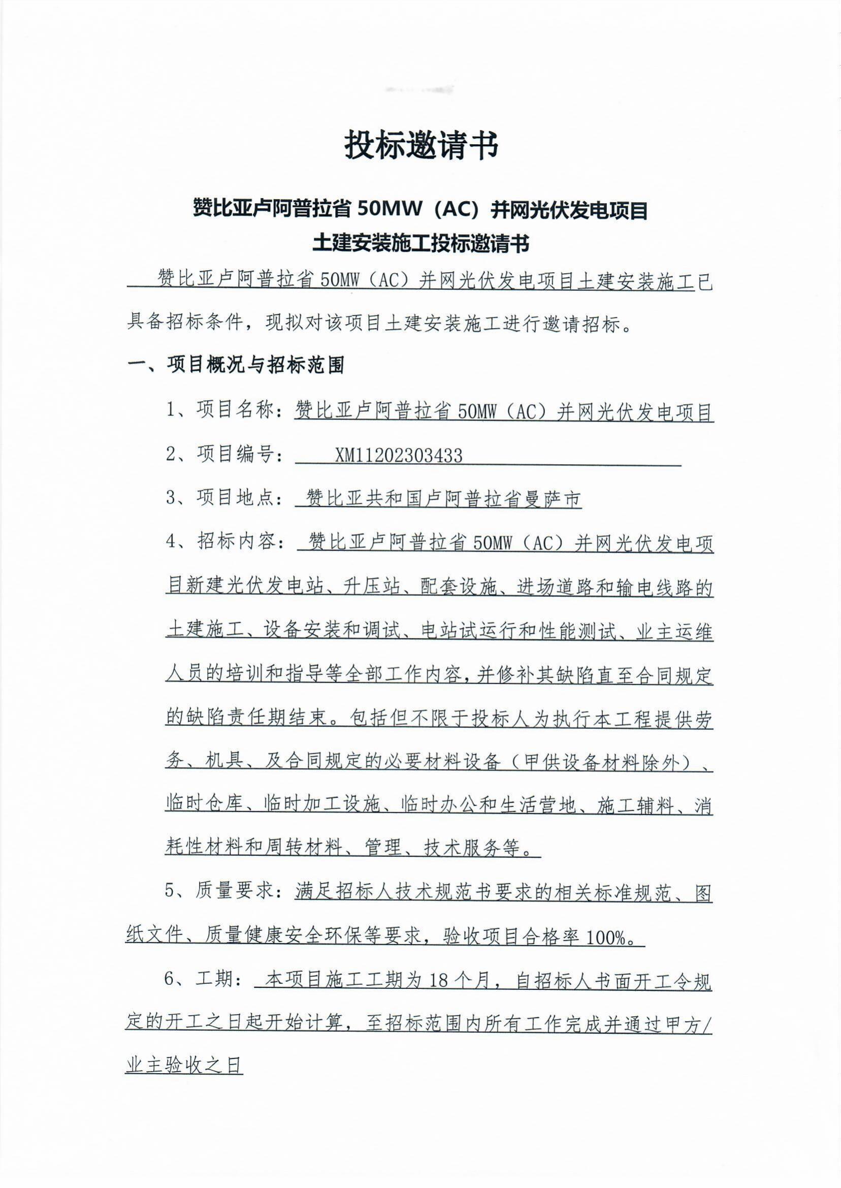赞比亚卢阿普拉省50MW(AC)并网光伏发电项目土建安装施工-投标邀请书