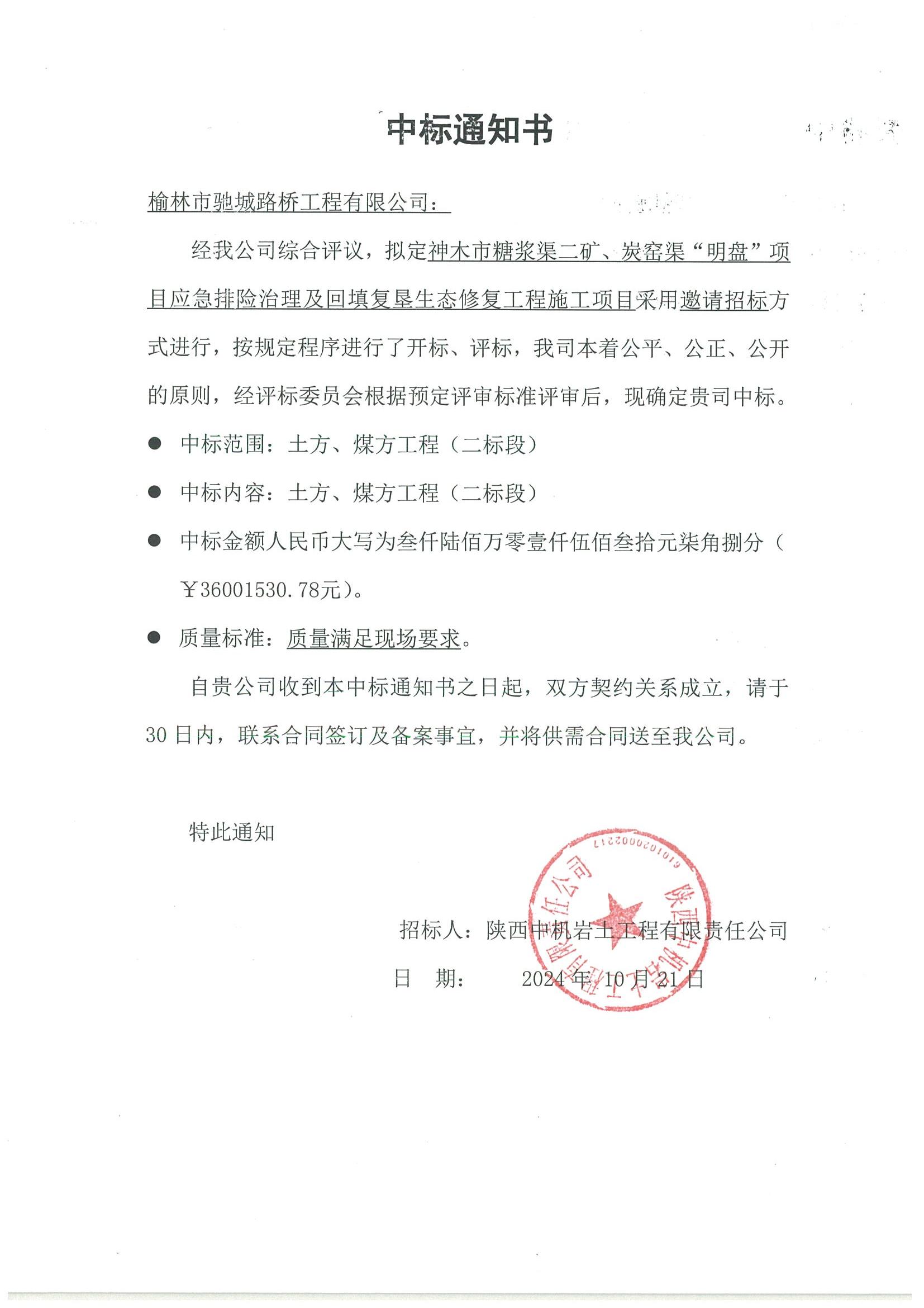 神木市糖浆渠二矿、炭窑渠“明盘”项目应急排险治理及回填复垦生态修复工程施工项目土方、煤方工程(二标段)机械设备租赁中标通知书-二标段