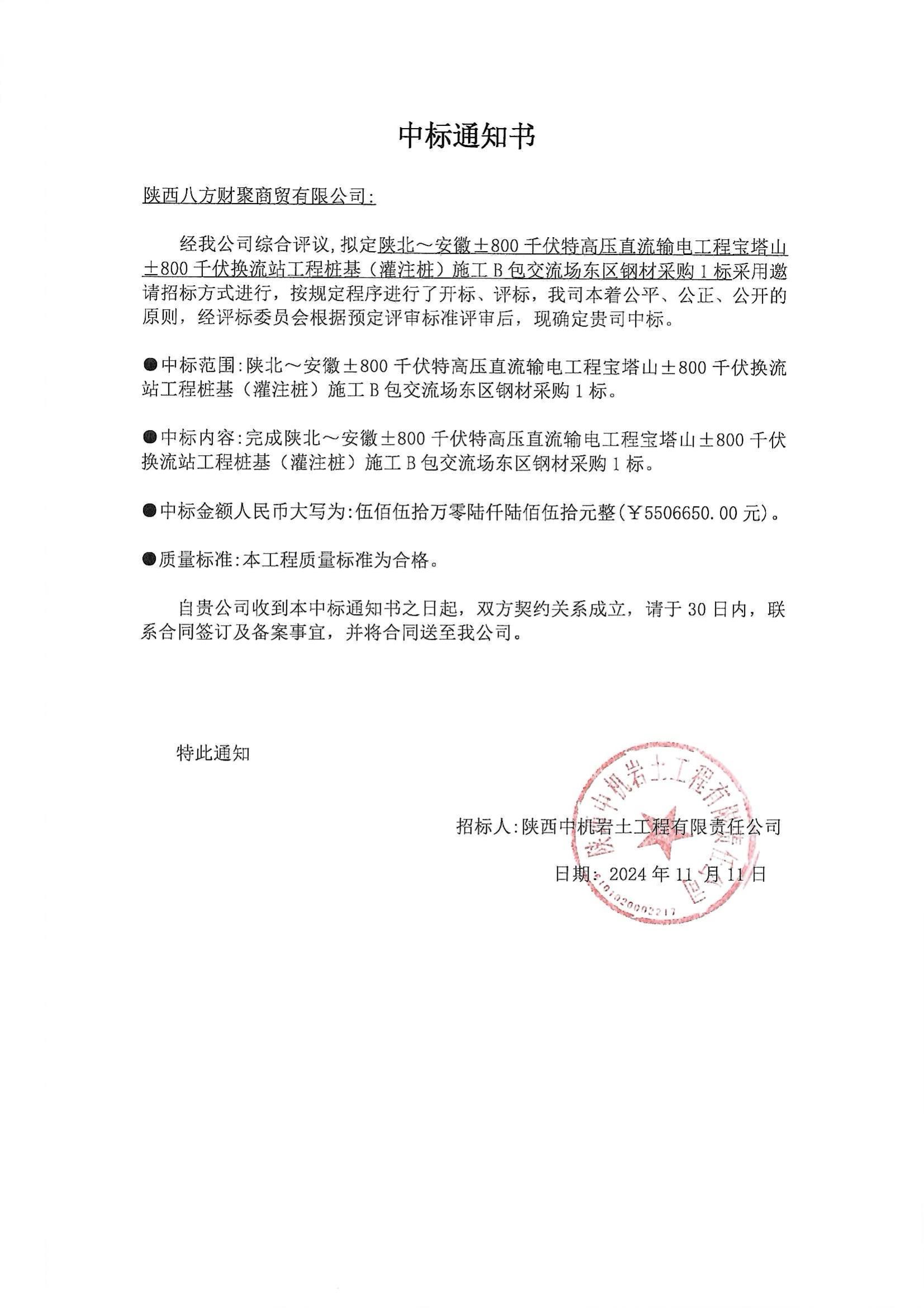 陕北~安徽±800千伏特高压直流输电工程宝塔山±800千伏换流站工程桩基(灌注桩)施工B包建设工程钢材采购1标中标通知书