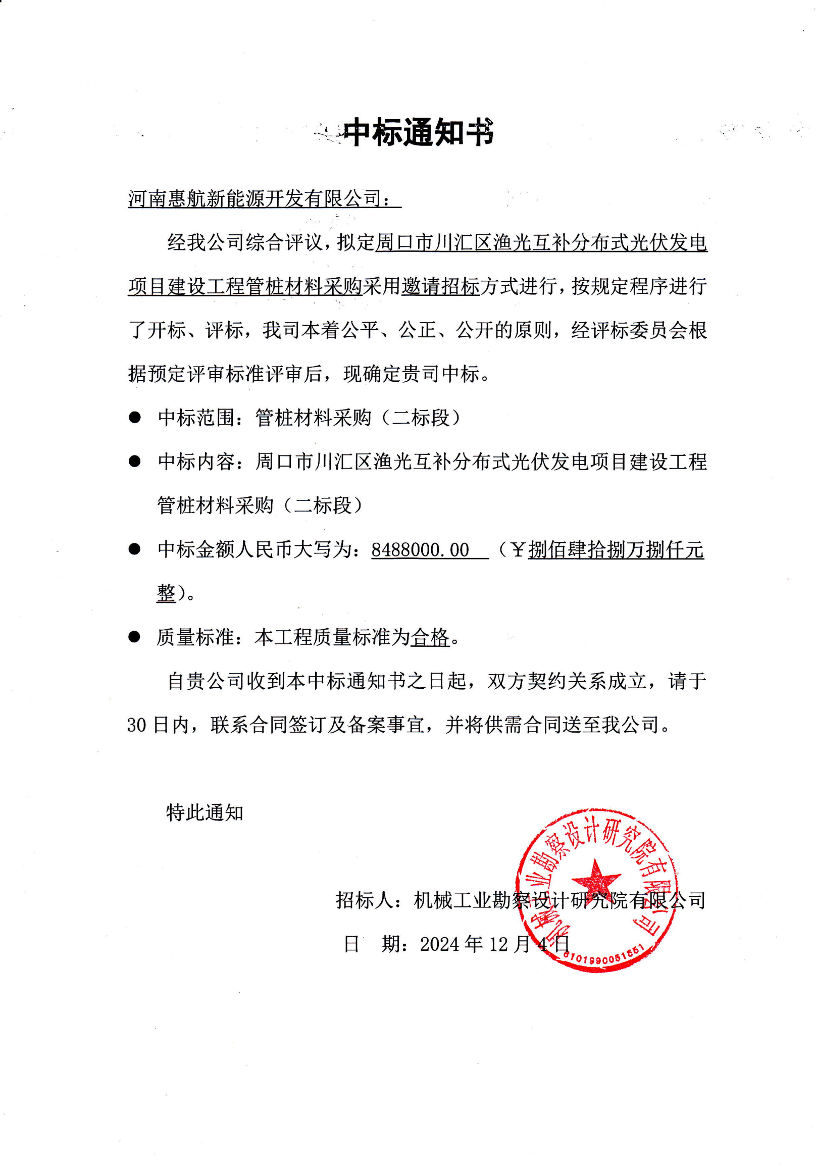 周口市川汇区渔光互补分布式光伏发电项目建设工程管桩材料采购招标文件(二标段)中标通知书
