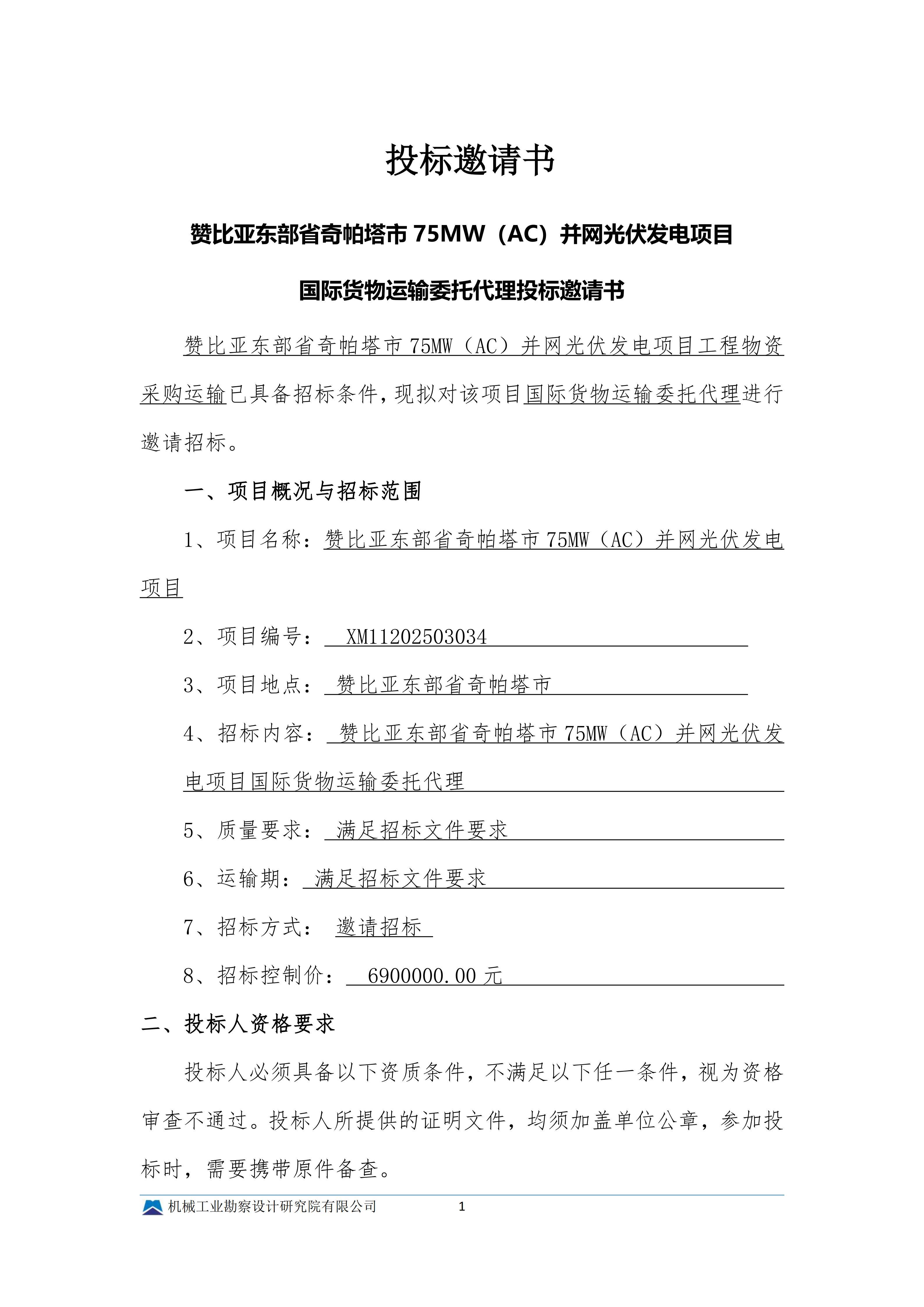 赞比亚奇帕塔西75MW(AC)并网光伏发电项目工程物资运输委托代理投标邀请书