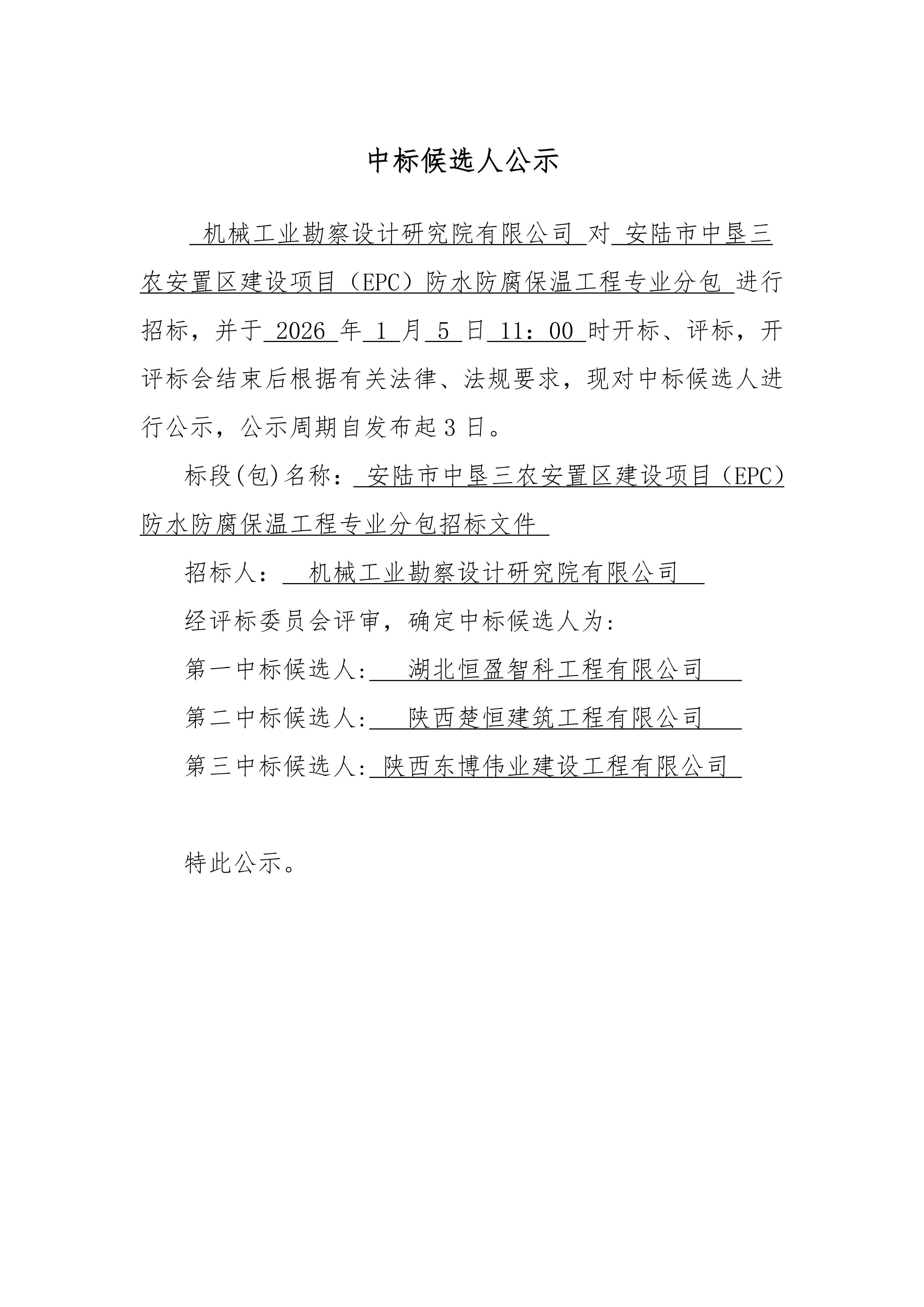 安陆市中垦三农安置区建设项目(EPC) 防水防腐保温工程 专业分包中标候选人公示