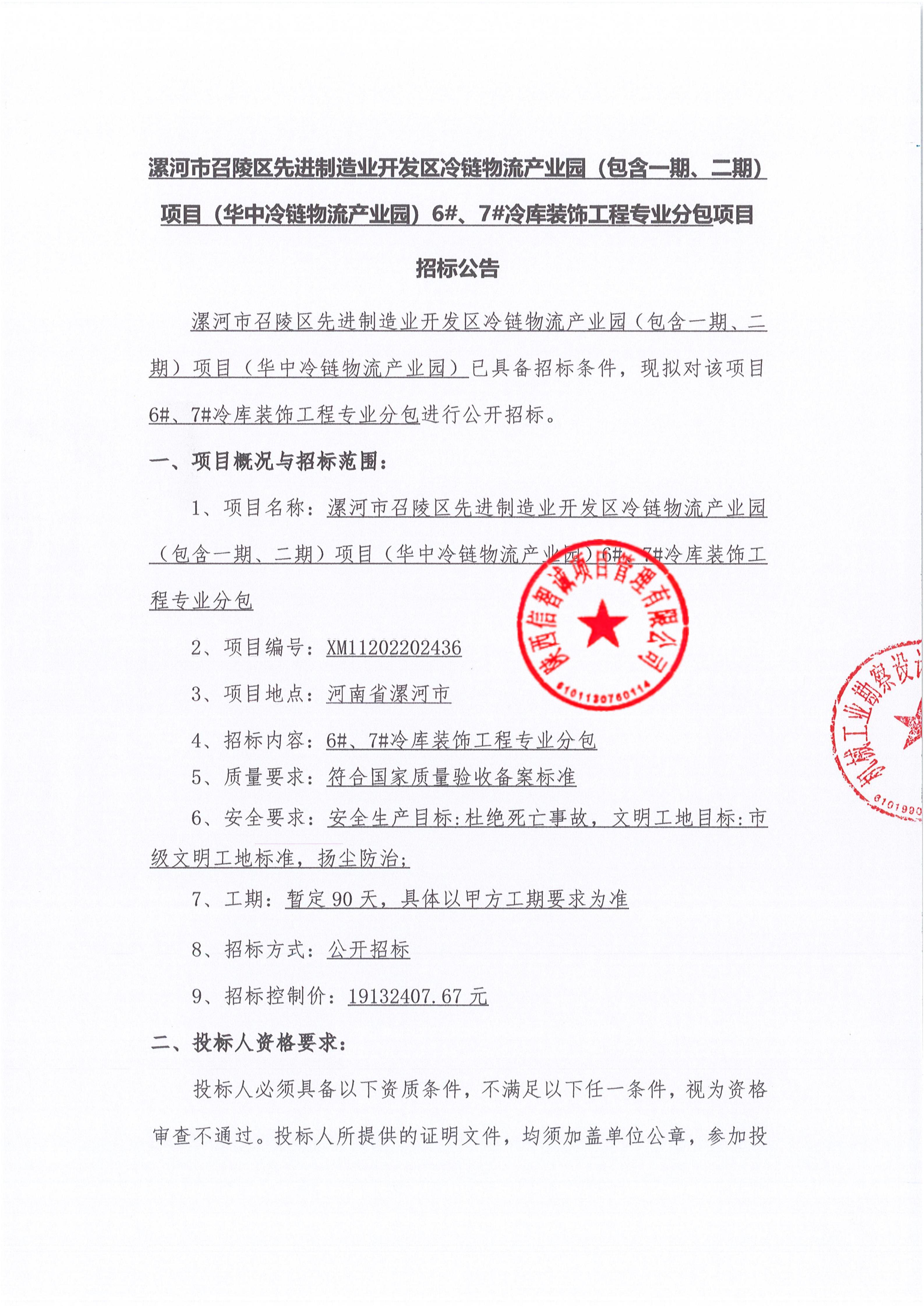 漯河市召陵区先进制造业开发区冷链物流产业园(包含一期、二期)项目(华中冷链物流产业园)6#、7#冷库装饰工程专业分包招标公告