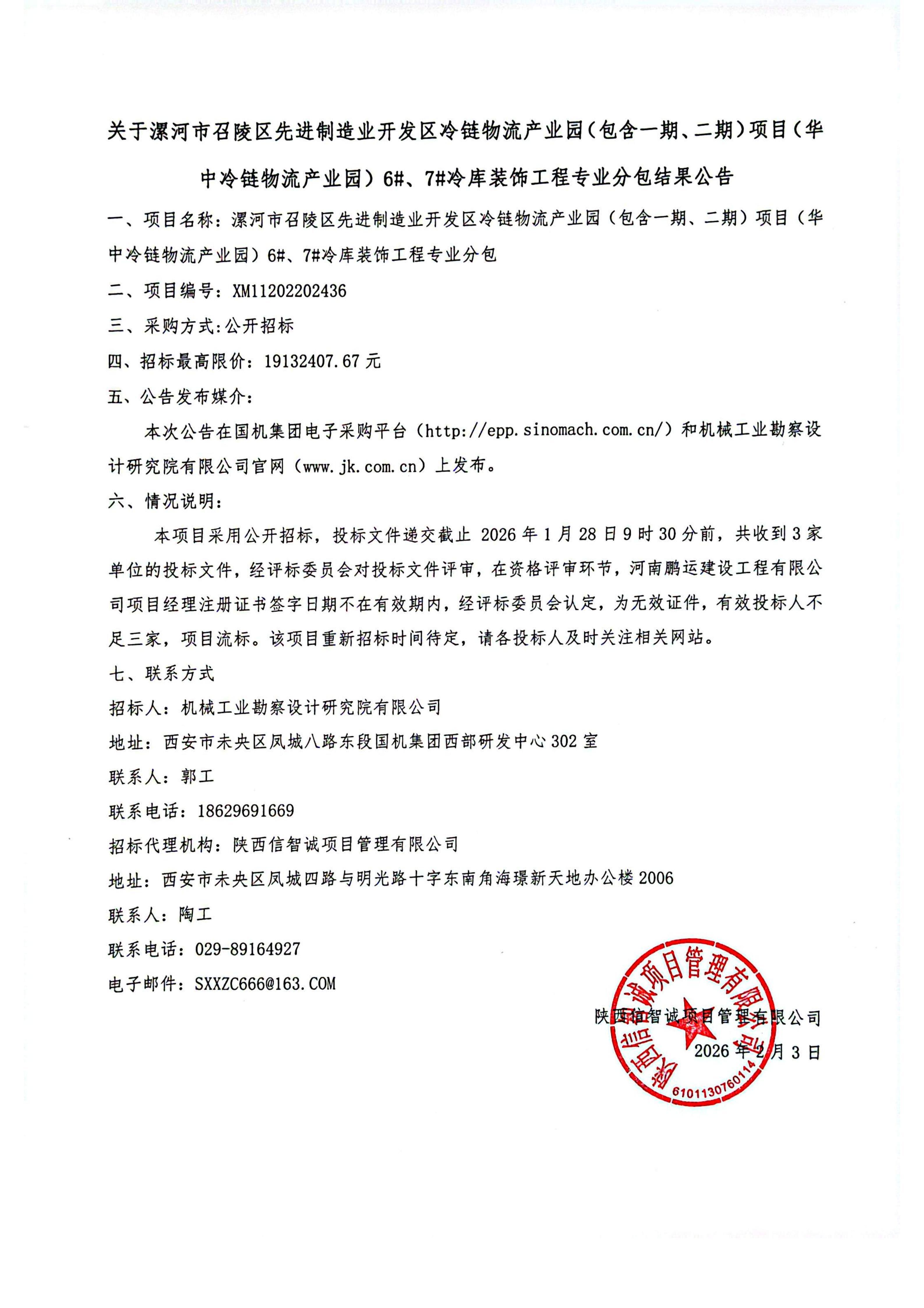 漯河市召陵区先进制造业开发区冷链物流产业园(包含一期、二期)项目(华中冷链物流产业园)6#、7#冷库装饰工程专业分包流标公告